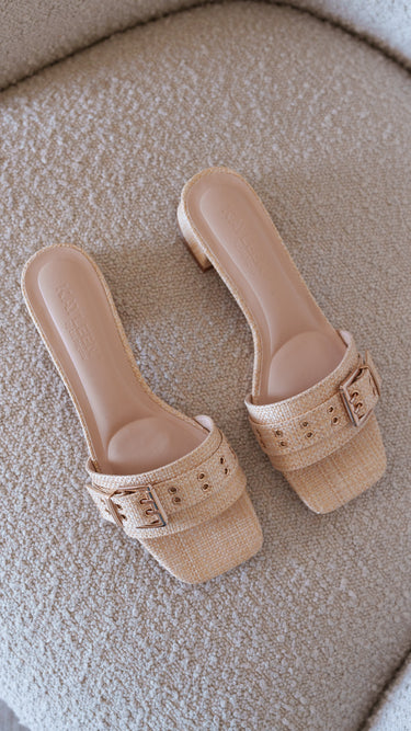 Meet your new sunny-day staple. These woven slide heels bring effortless vacation vibes wherever you go and no passport required. With a natural raffia texture, a statement buckle, and a comfy low block heel, they’re the perfect mix of laid-back and polished. Easy to slip on, easy to style, and very easy to love, these are made for brunch dates, beachside walks, and everything in between.