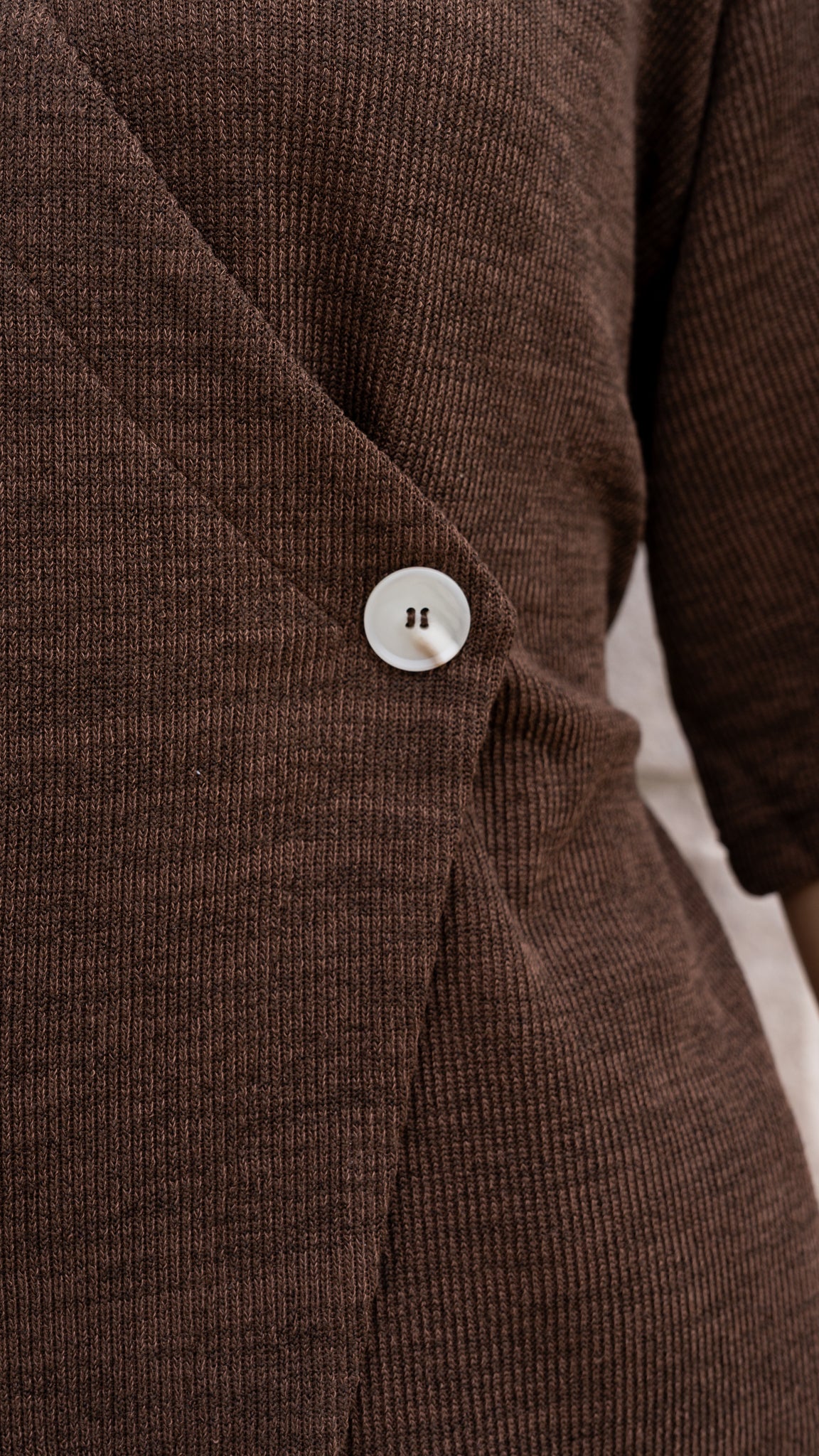 - Crossover wrap front with an inner snap button and outer button closure.