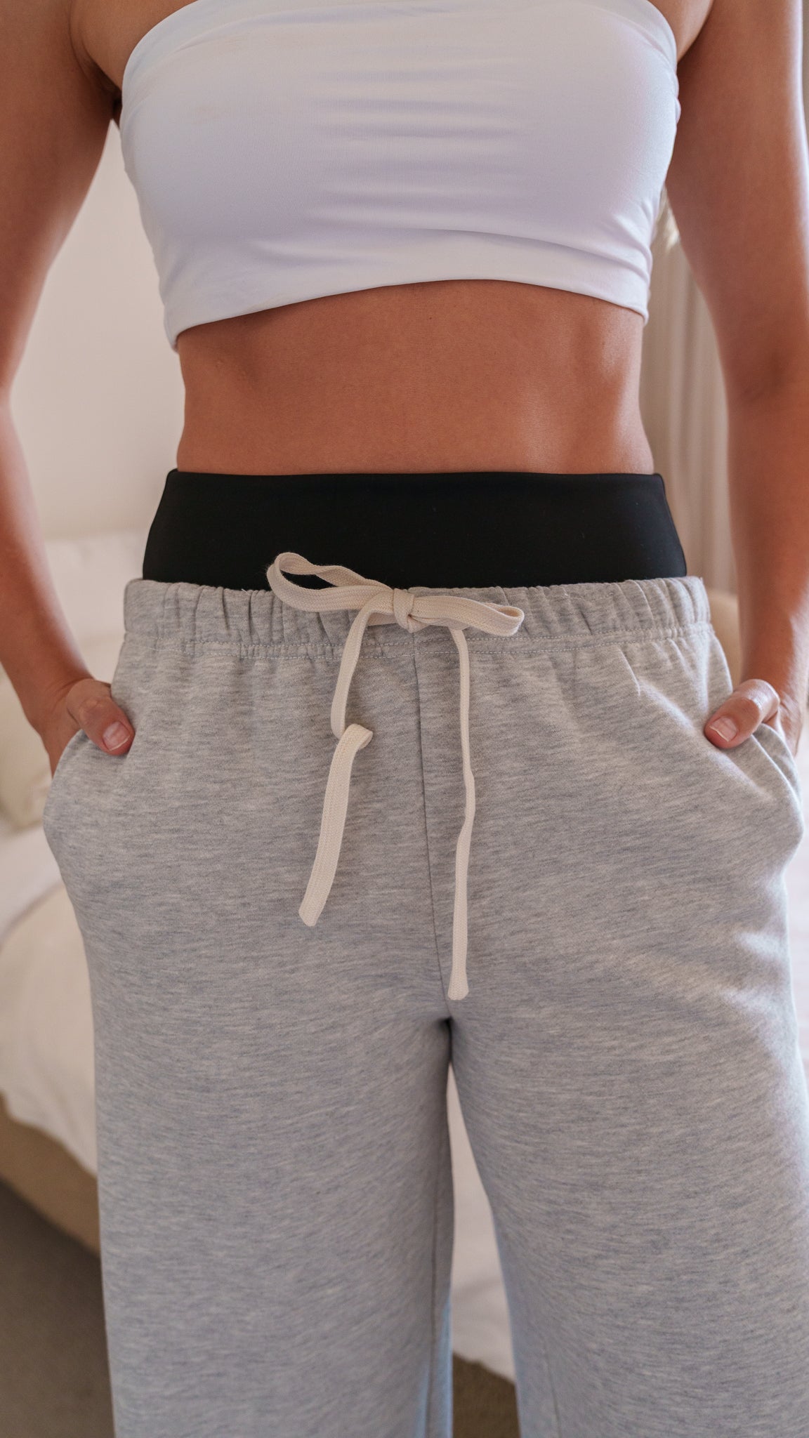 Our CAITLIN Wide Leg Trackies feature a contrast nylon-span waistband designed for tummy control and a flattering silhouette. These full-length pants offer a relaxed fit, an adjustable drawstring waistband, and functional side pockets for the perfect blend of comfort and style.