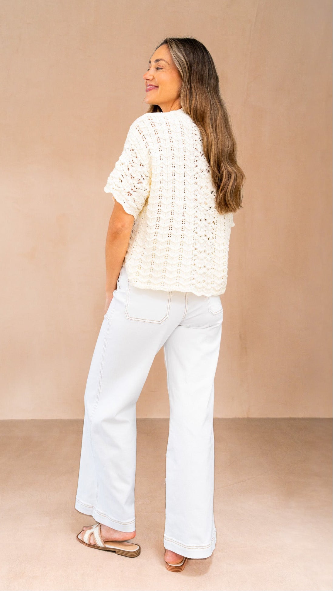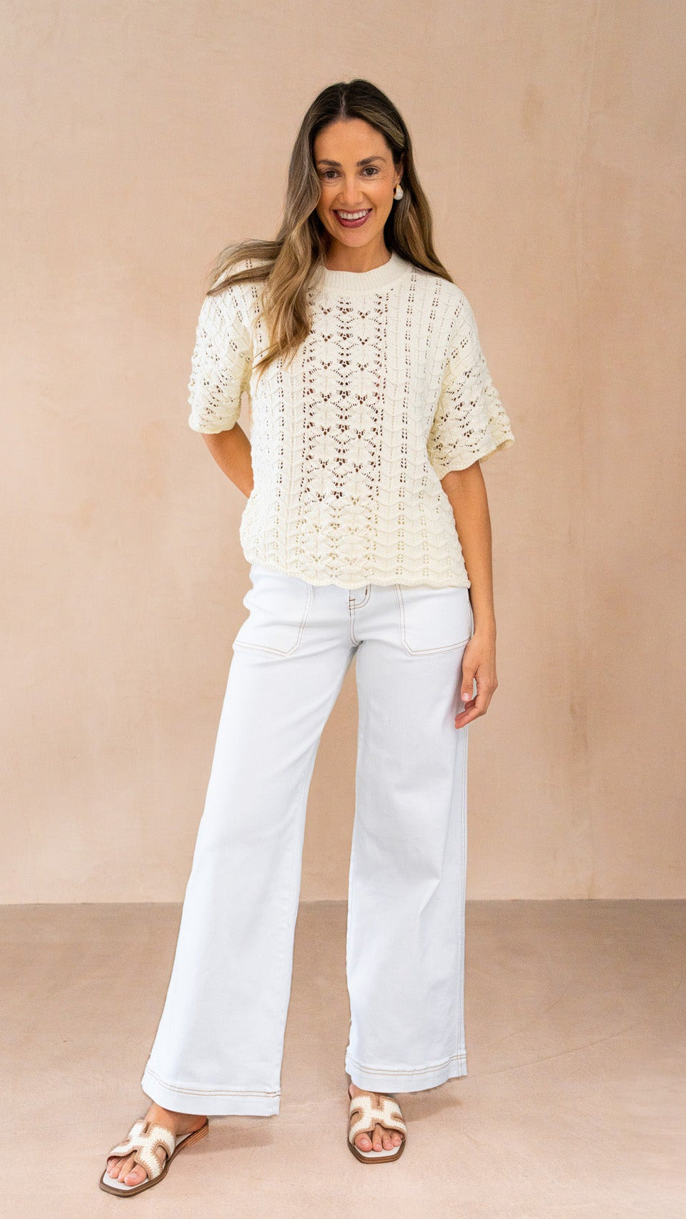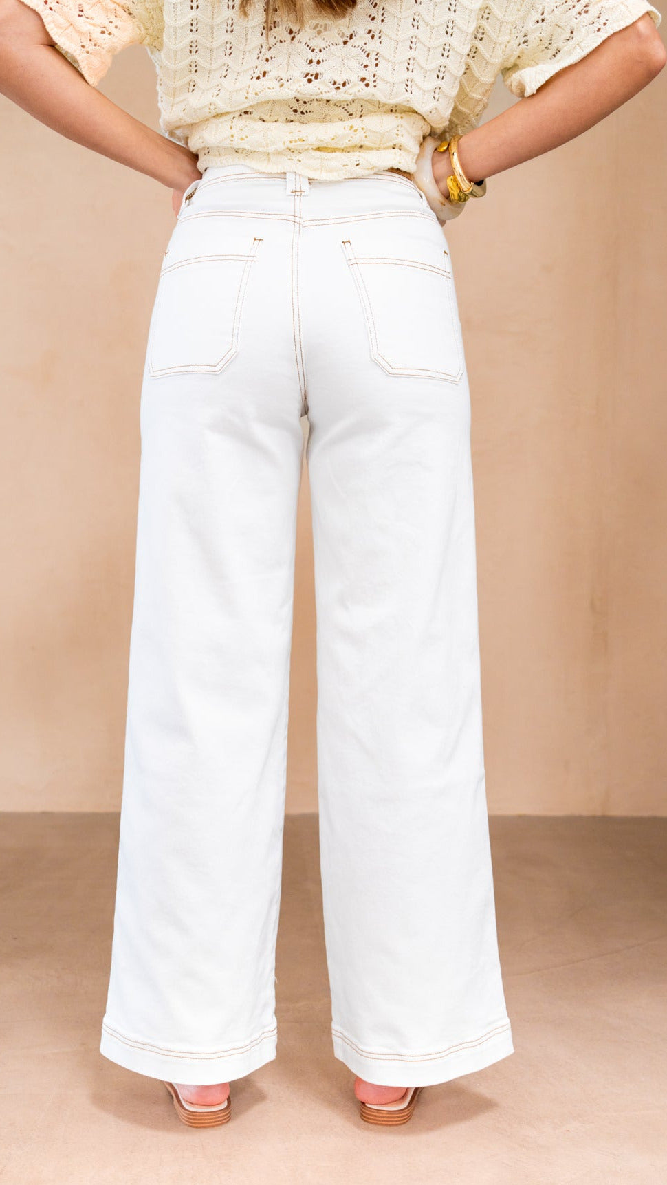 Our WINNIE Jeans in White feature a high rise waist, contrast stitching, front and back pockets, and super soft stretch denim for a comfy, flattering fit.