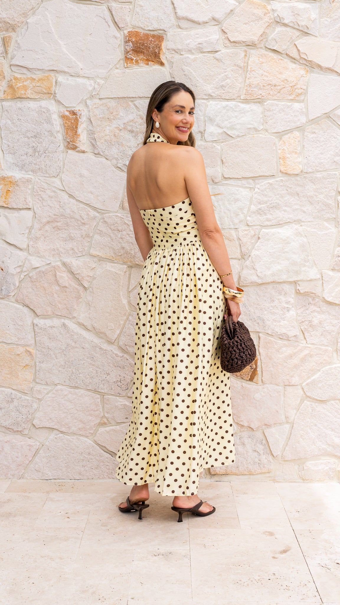 Introducing our SAMMI Maxi - a fresh, playful take on timeless elegance. Designed with a flattering halter neckline and a softly gathered midi skirt, this dress blends vintage charm with modern sophistication. Its buttery yellow base and chocolate polka dots make it the perfect sunshine ready look for brunches, garden parties, or any moment you want to feel effortlessly chic!