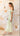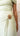 • Dramatic side drape, secured with a circular gold acrylic accent ring at the waist.