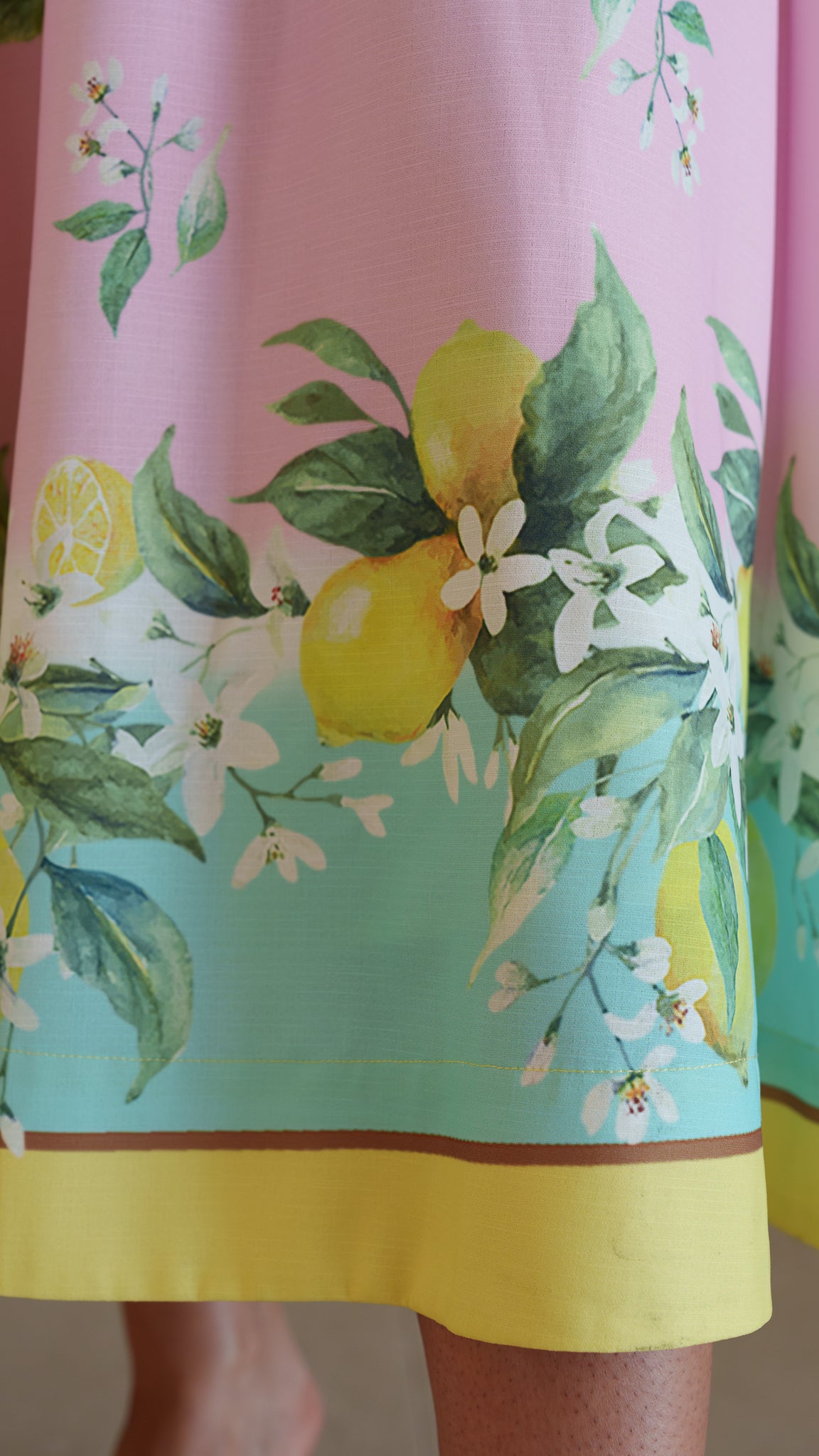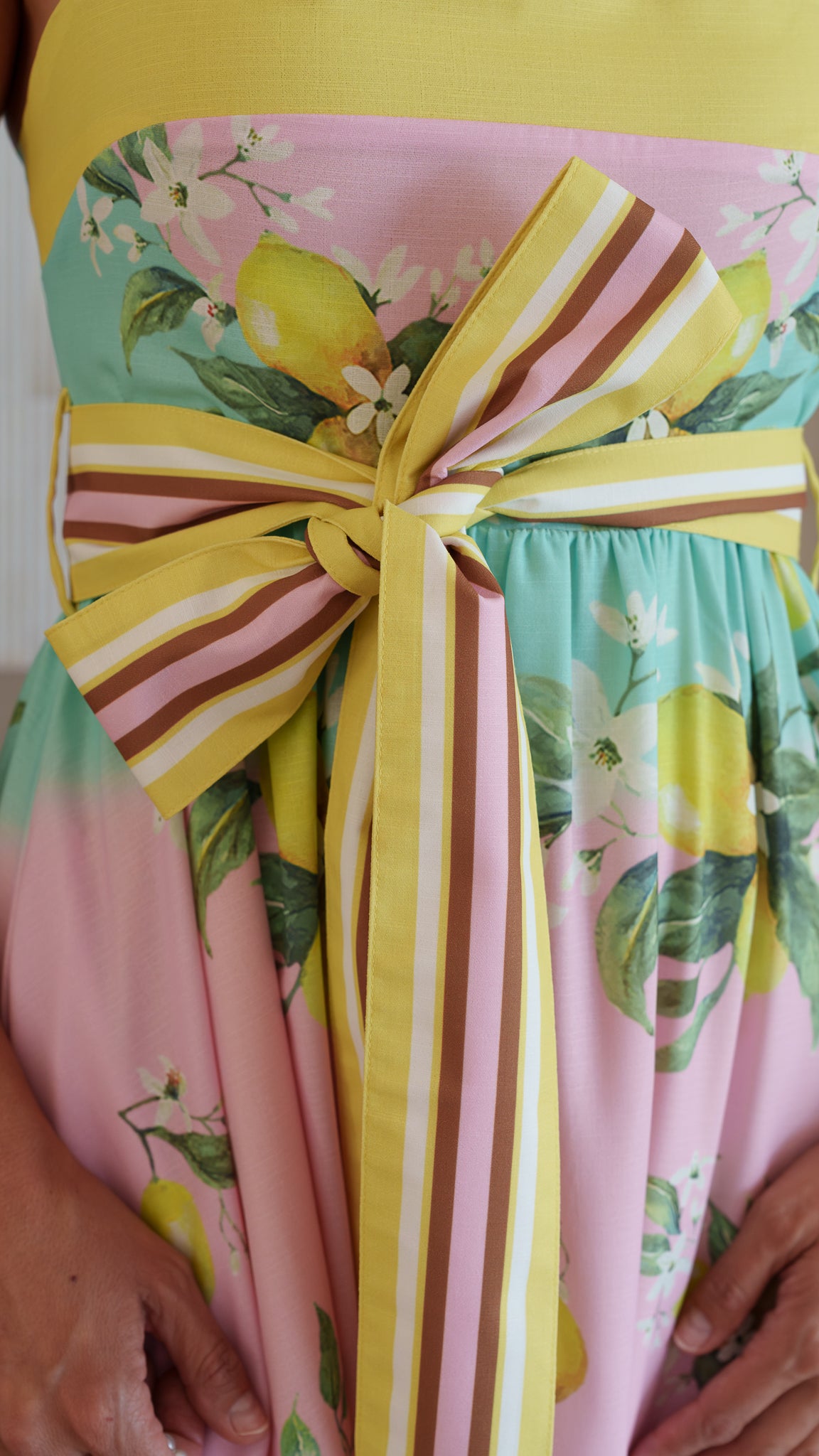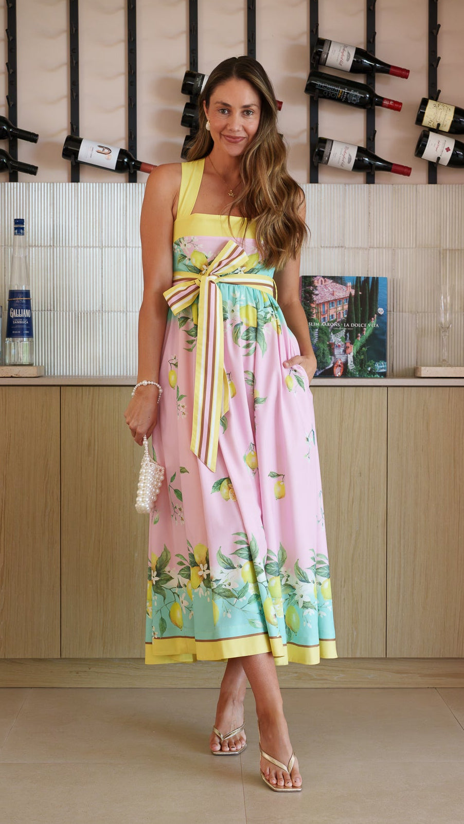 Turn heads in our breezy CINZIA Maxi, sun-kissed maxi dress designed for effortless summer elegance. Featuring a soft pink base with a fresh lemon and floral print, a flattering square neckline, and wide shoulder straps, it cinches at the waist with a striped tie belt for a feminine silhouette. Lightweight and flowy, this dress is perfect for beach days, garden parties, or warm-weather getaways.