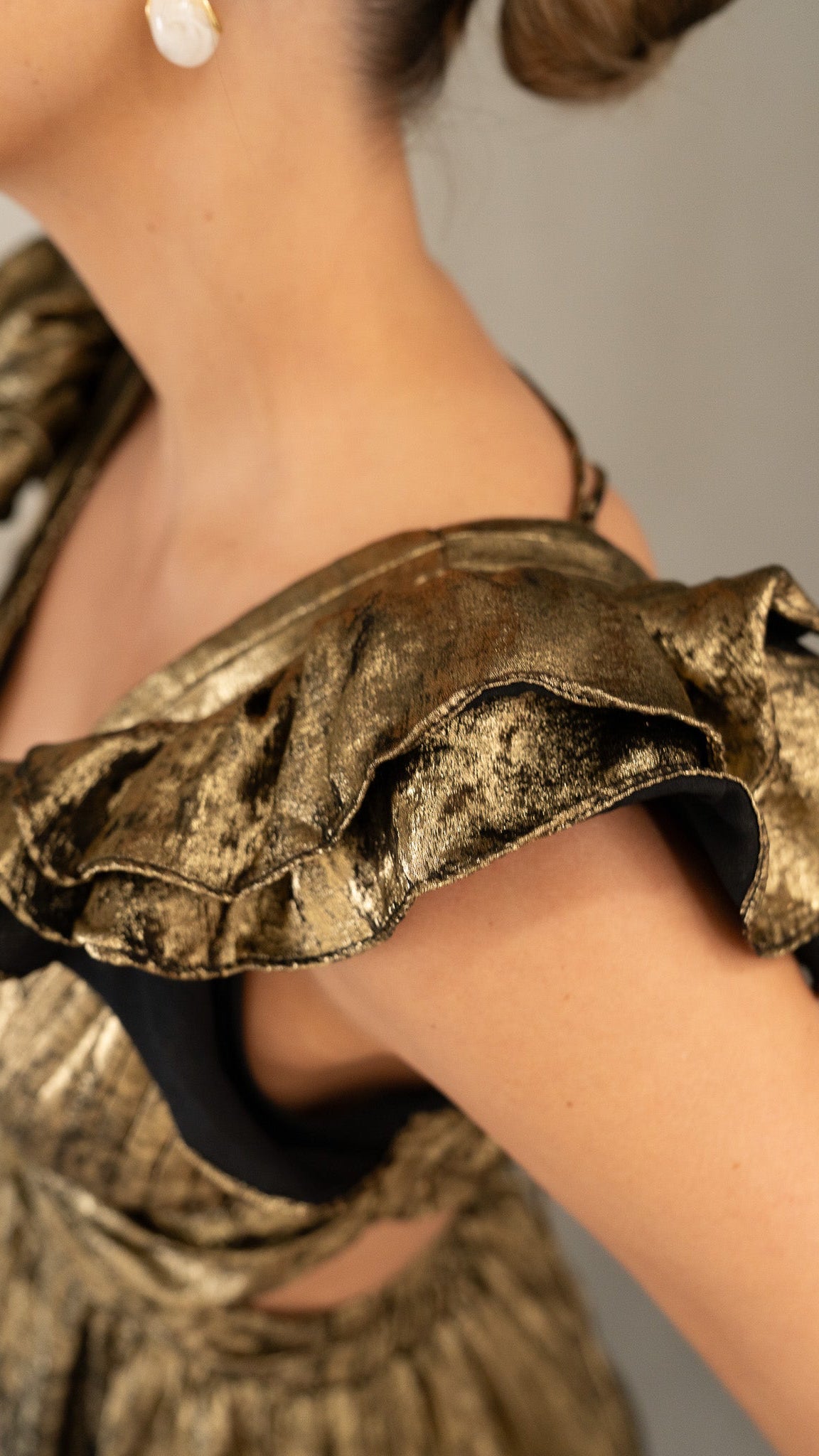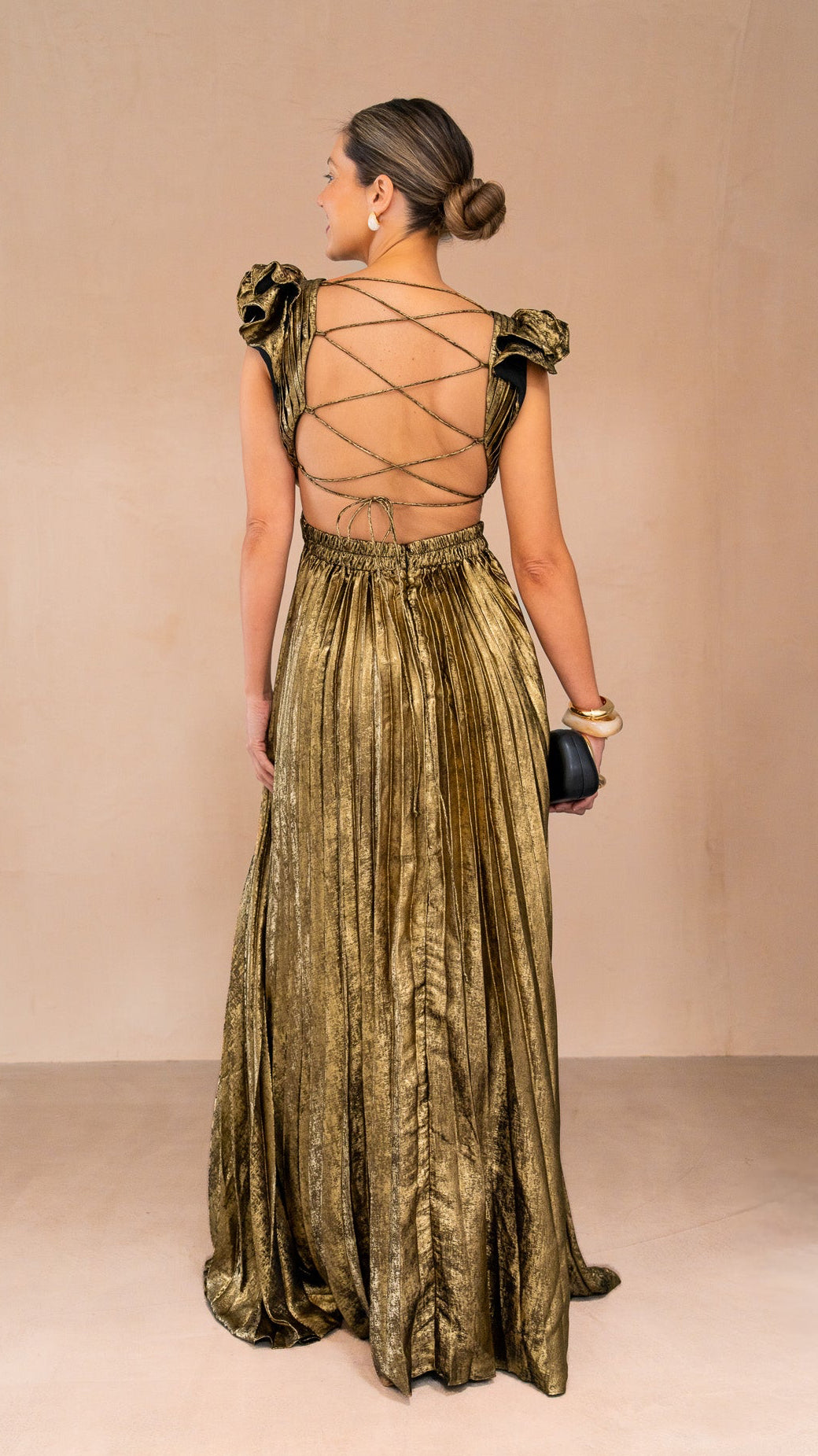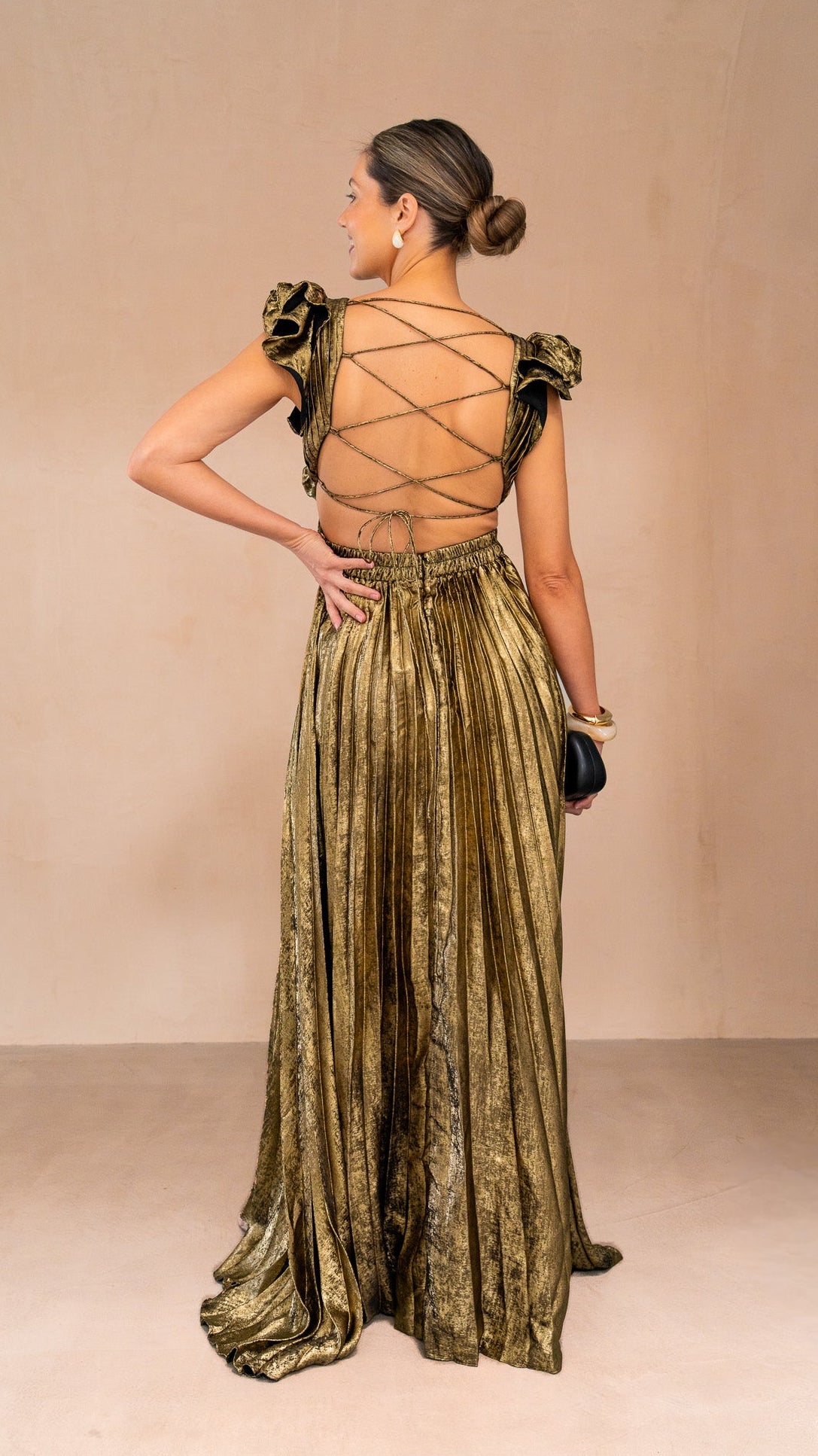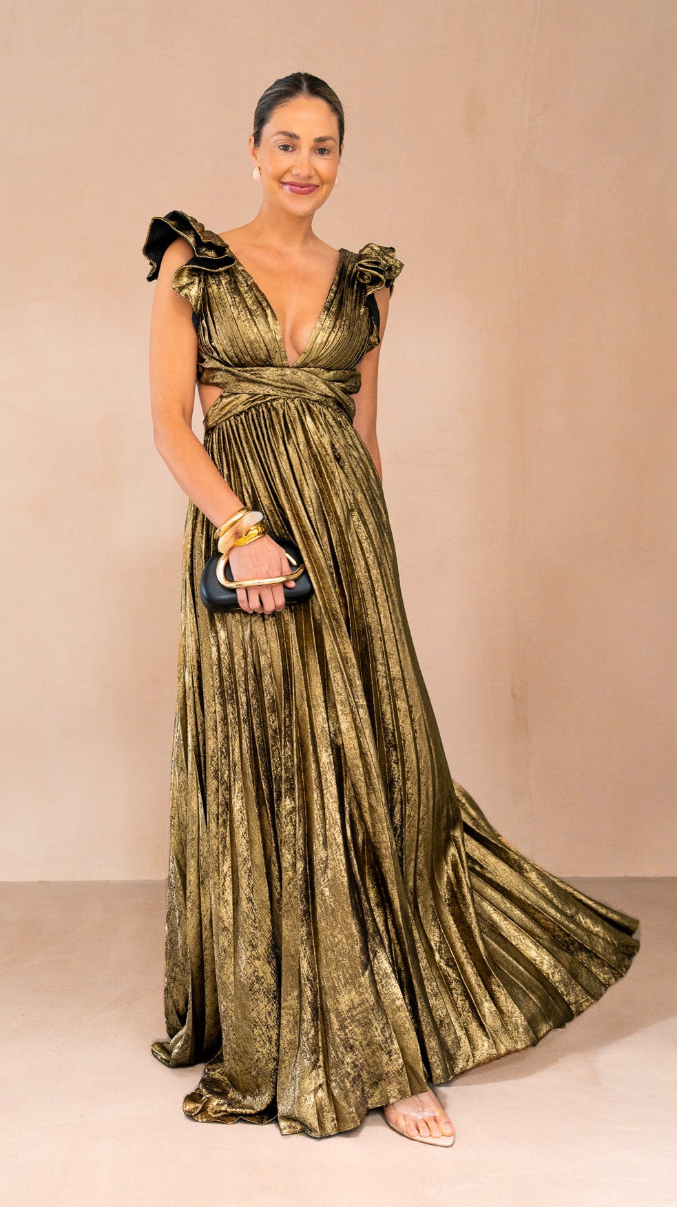 • Shine bright in our stunning MADDEN Pleat Maxi Dress. This show-stopping gown features luxurious metallic pleating that catches the light beautifully with every movement, creating an unforgettable entrance.