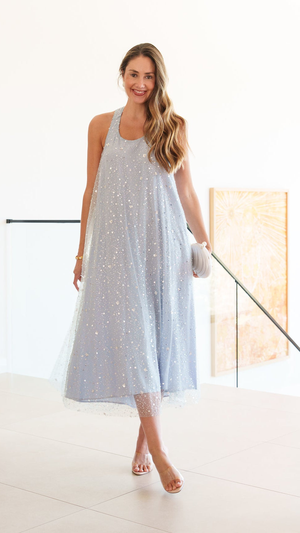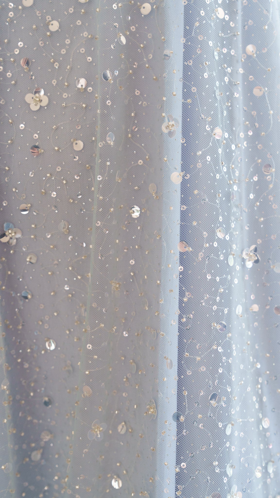 - Dusty blue with tulle mesh overlay and detail sequin and beads.