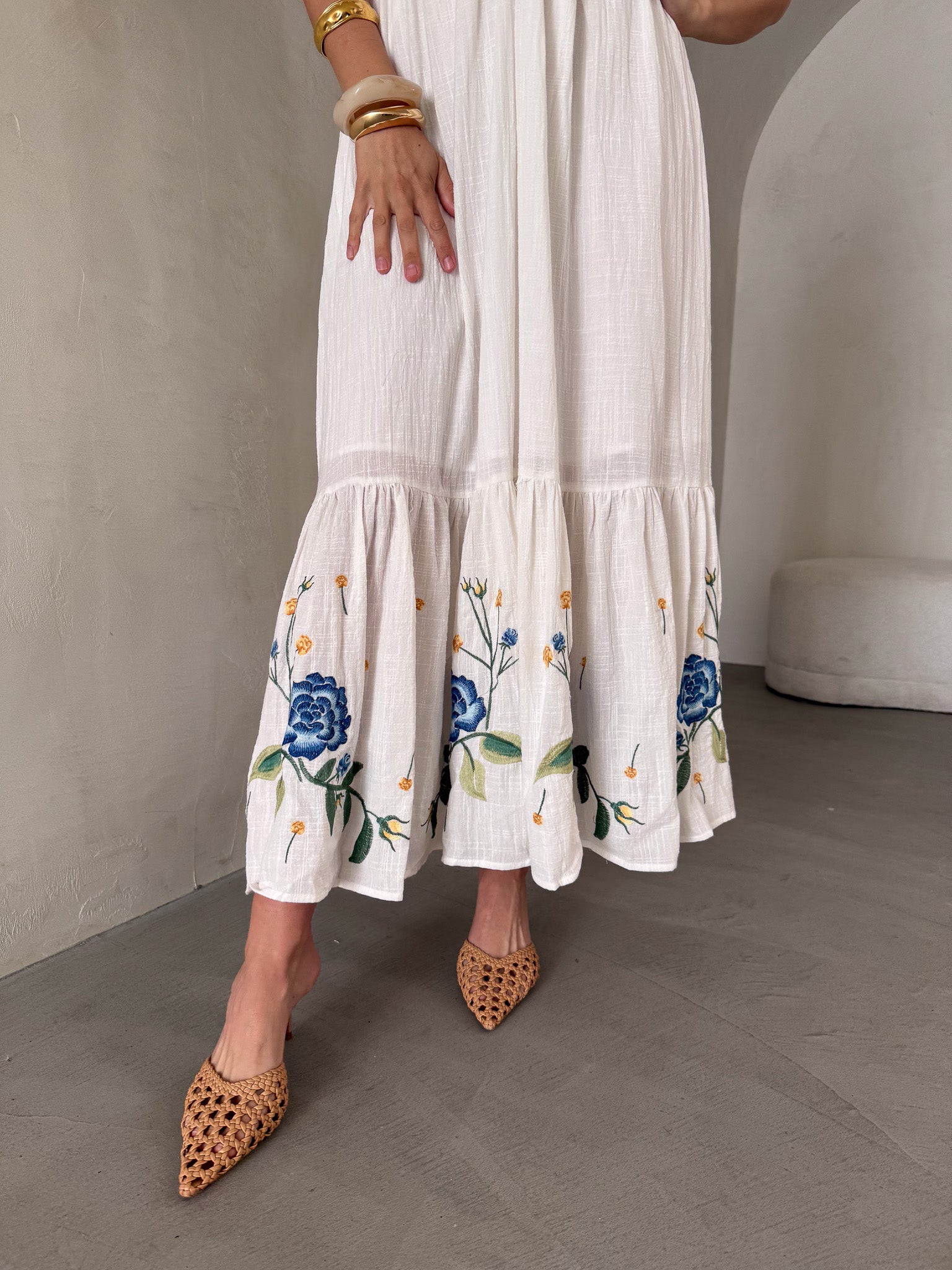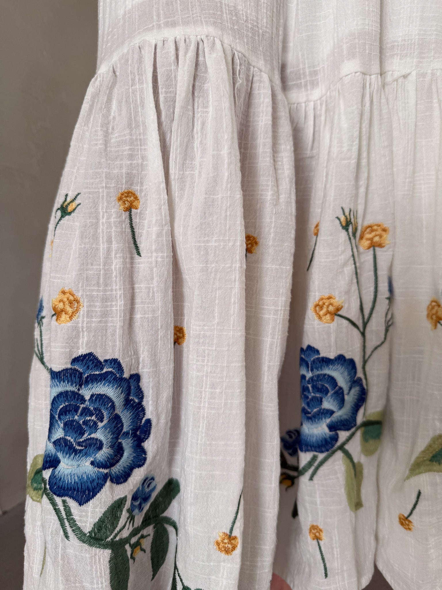 - Ruffled hemline with floral embroidery.
