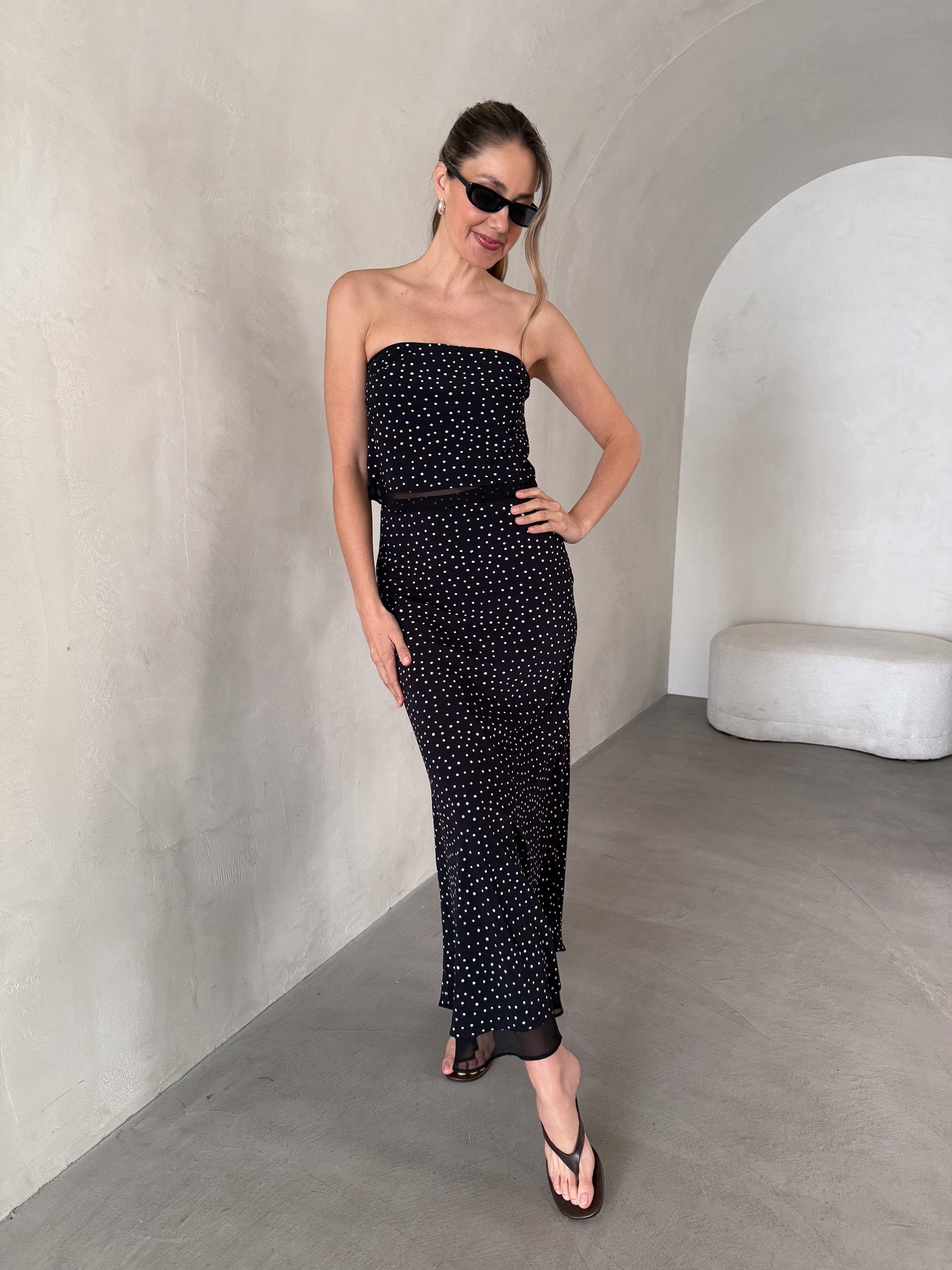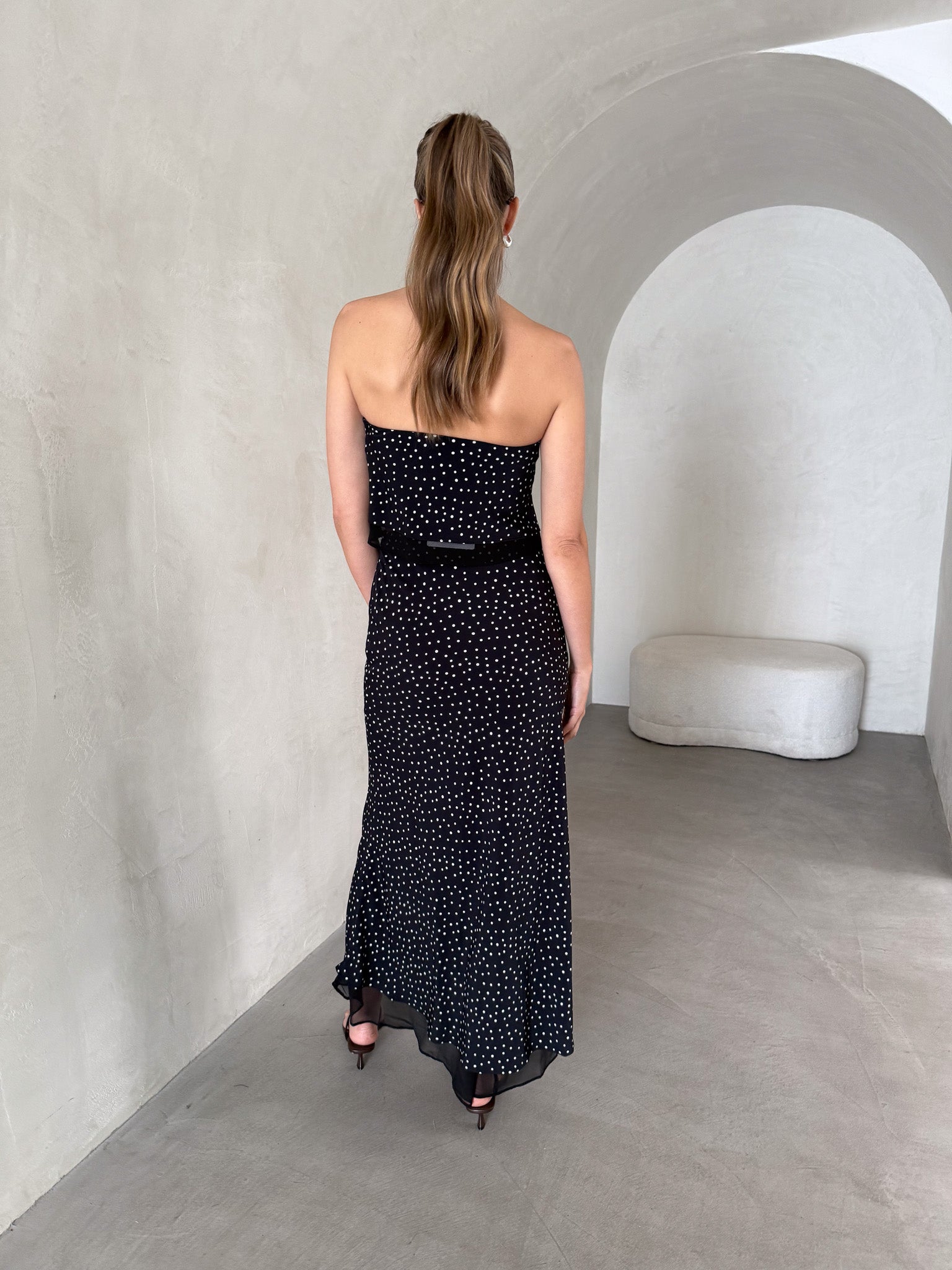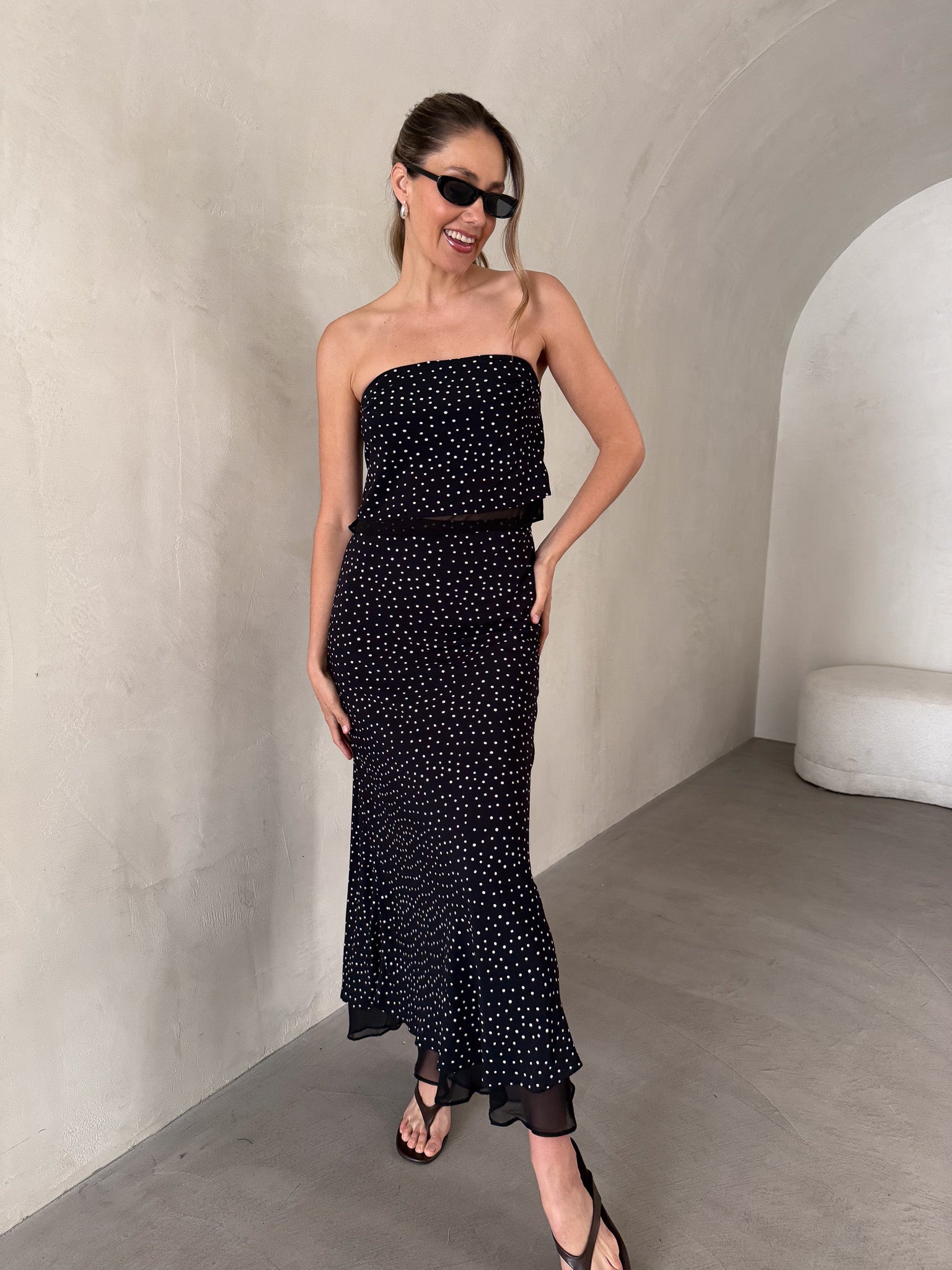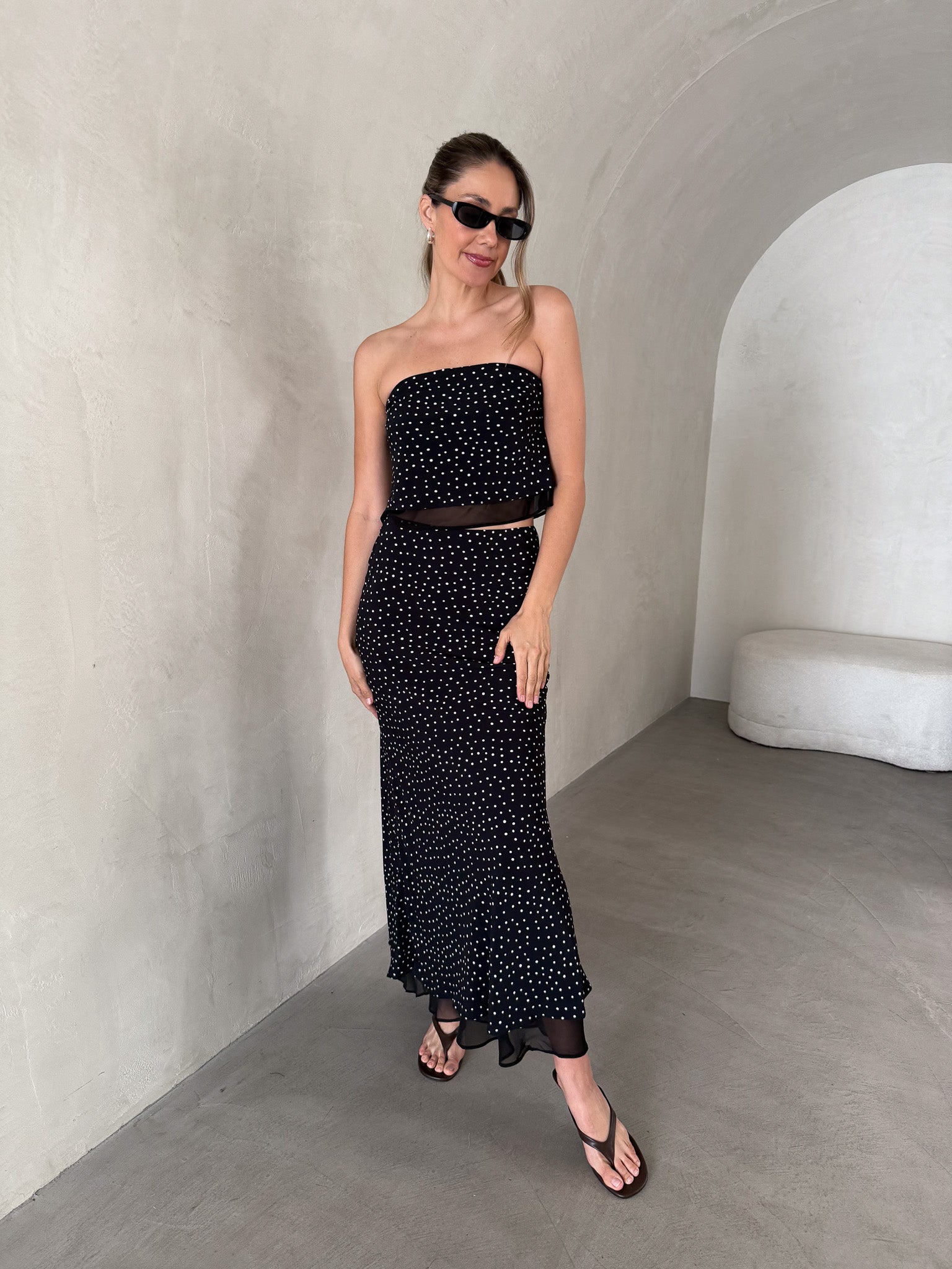 - Featuring a sleeveless top with polka dots and black chiffon underlay.