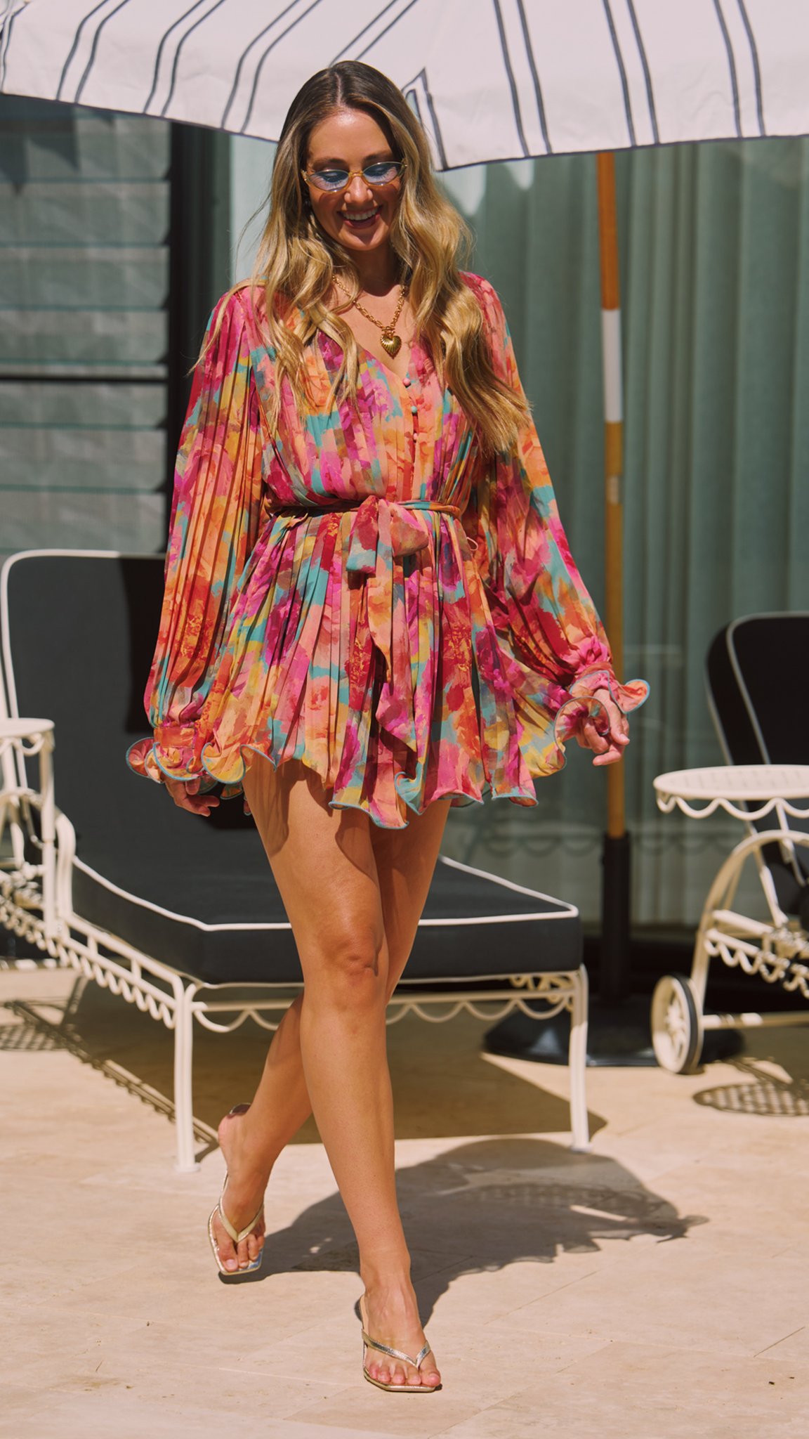 Playful, romantic and effortlessly Parisian. The Amelie Playsuit from our Parisian Floral collection is designed to make a statement. Featuring a flattering V neckline, soft pleated detailing and floaty long sleeves with delicate ruffle cuffs, this piece blends feminine charm with modern edge. The waist tie cinches you in beautifully, while the painterly floral print in rich sunset tones brings that dreamy European summer feel. Flirty, feminine and made for golden hour moments.