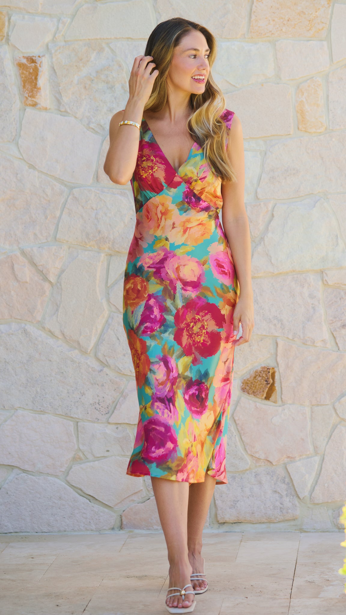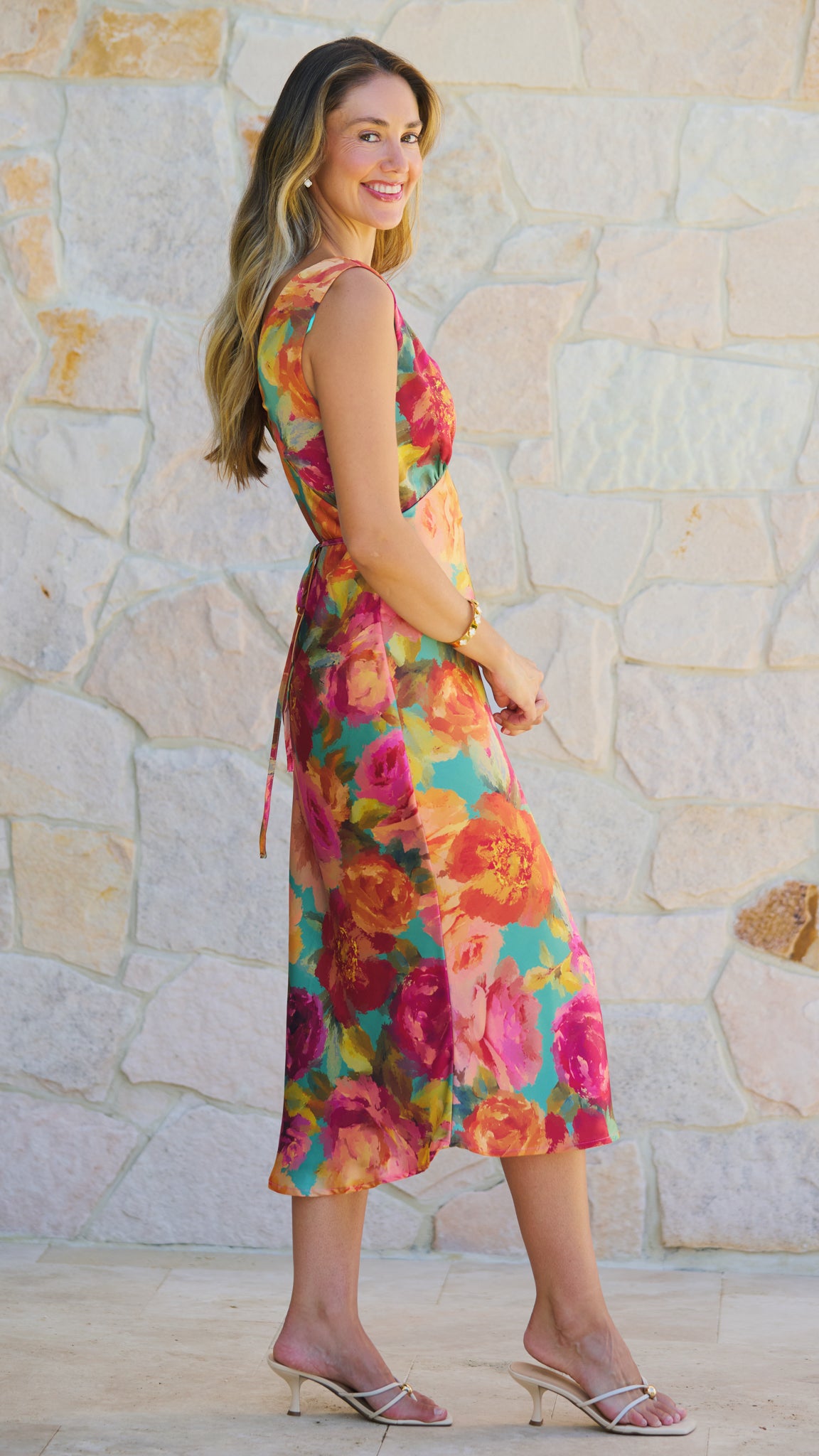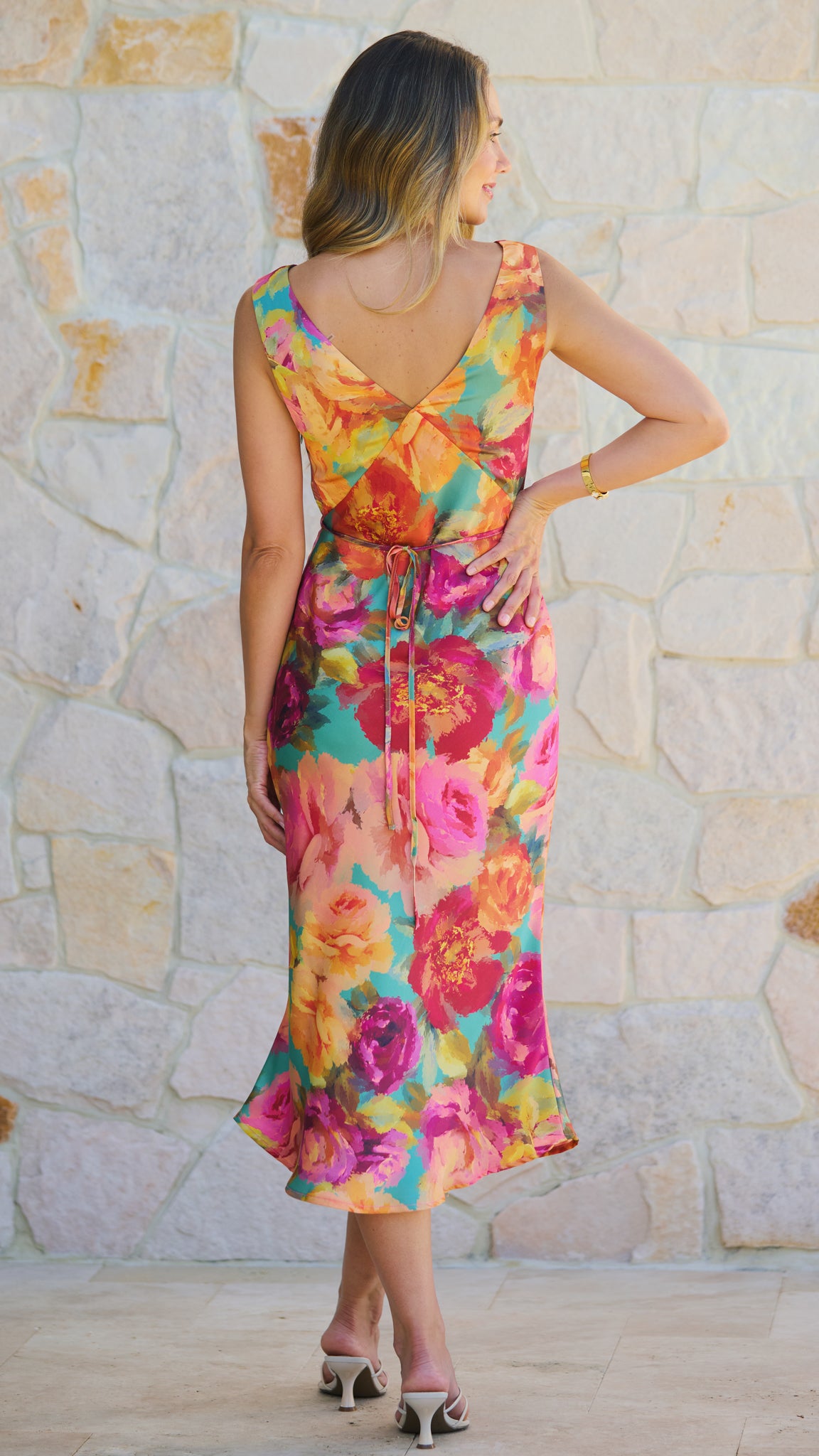 Romantic, refined and effortlessly chic, The Amelie Dress from our Parisian Floral collection is elegance made easy. Featuring a flattering deep V neckline and a softly skimming midi silhouette, this dress drapes beautifully in a luxe satin finish. The painterly floral print in rich blush, coral and berry tones evokes a dreamy European summer, while the low V-back with adjustable tie detail adds a subtle, feminine statement. Timeless with a touch of Parisian charm.