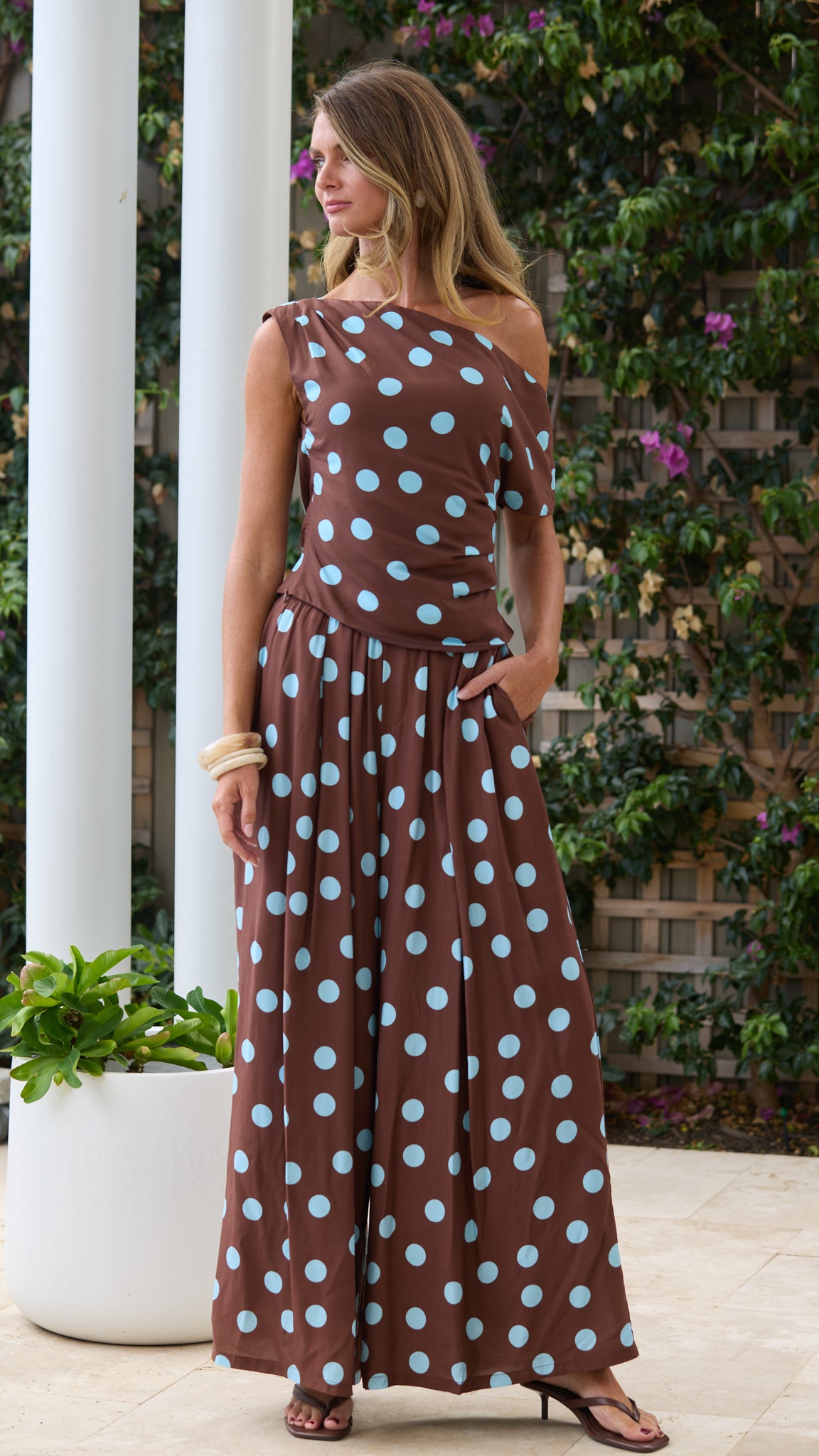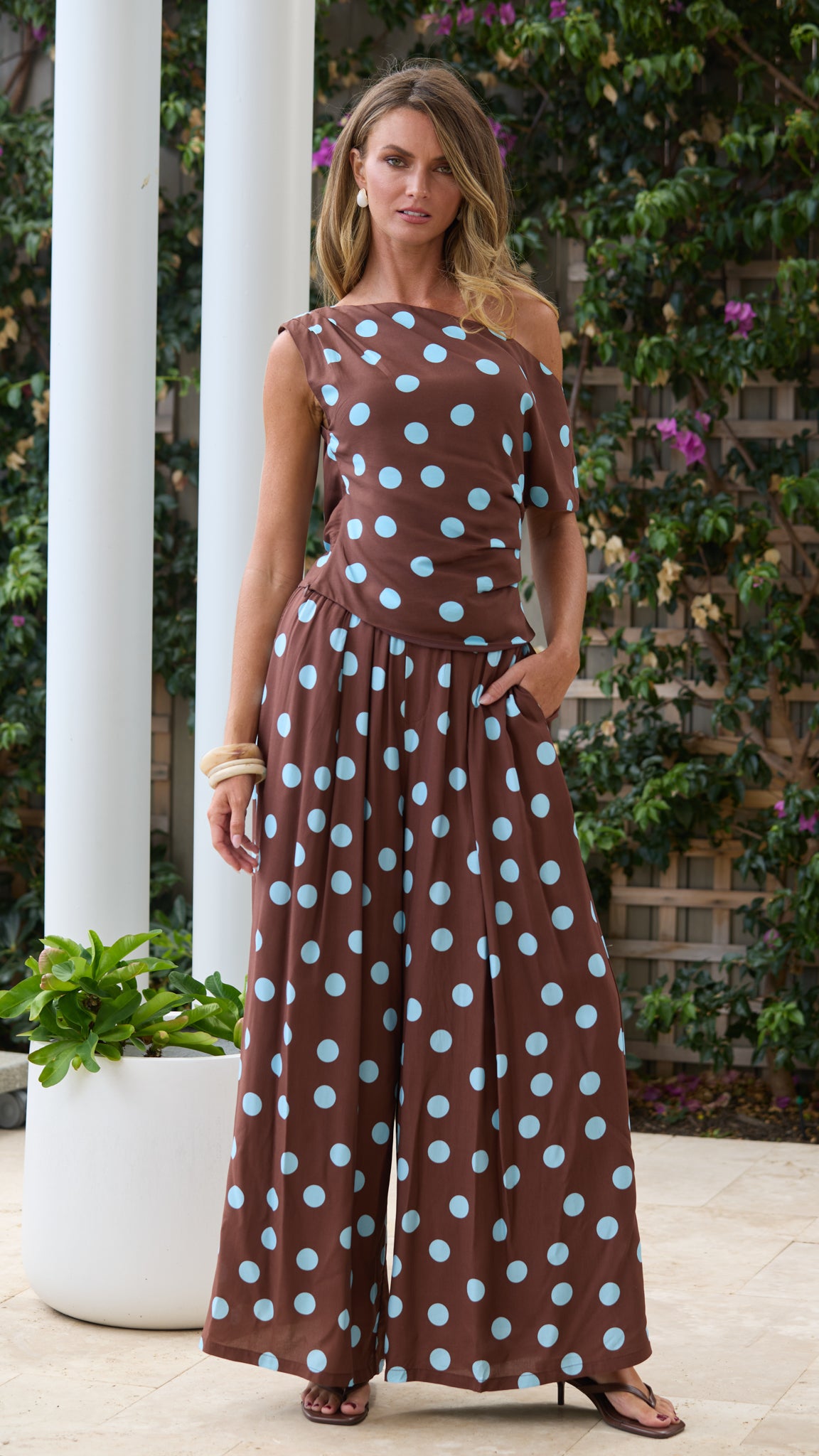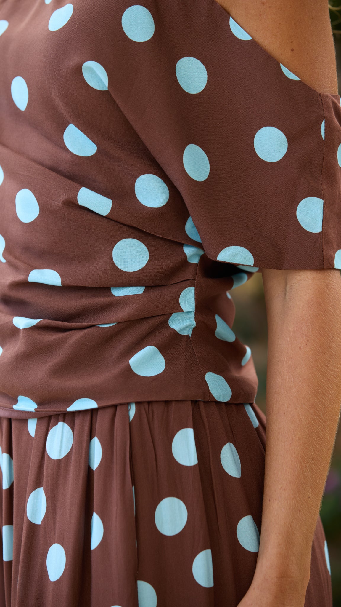 Playful with a modern twist, the ANYA Top brings effortless charm to any outfit. Featuring a flattering asymmetrical neckline and softly structured fit, it drapes beautifully across the body while highlighting the shoulders. The rich chocolate tone paired with soft blue polka dots adds a fun vintage-inspired touch, making it the perfect statement piece to style with the matching TAMSIN Pants.