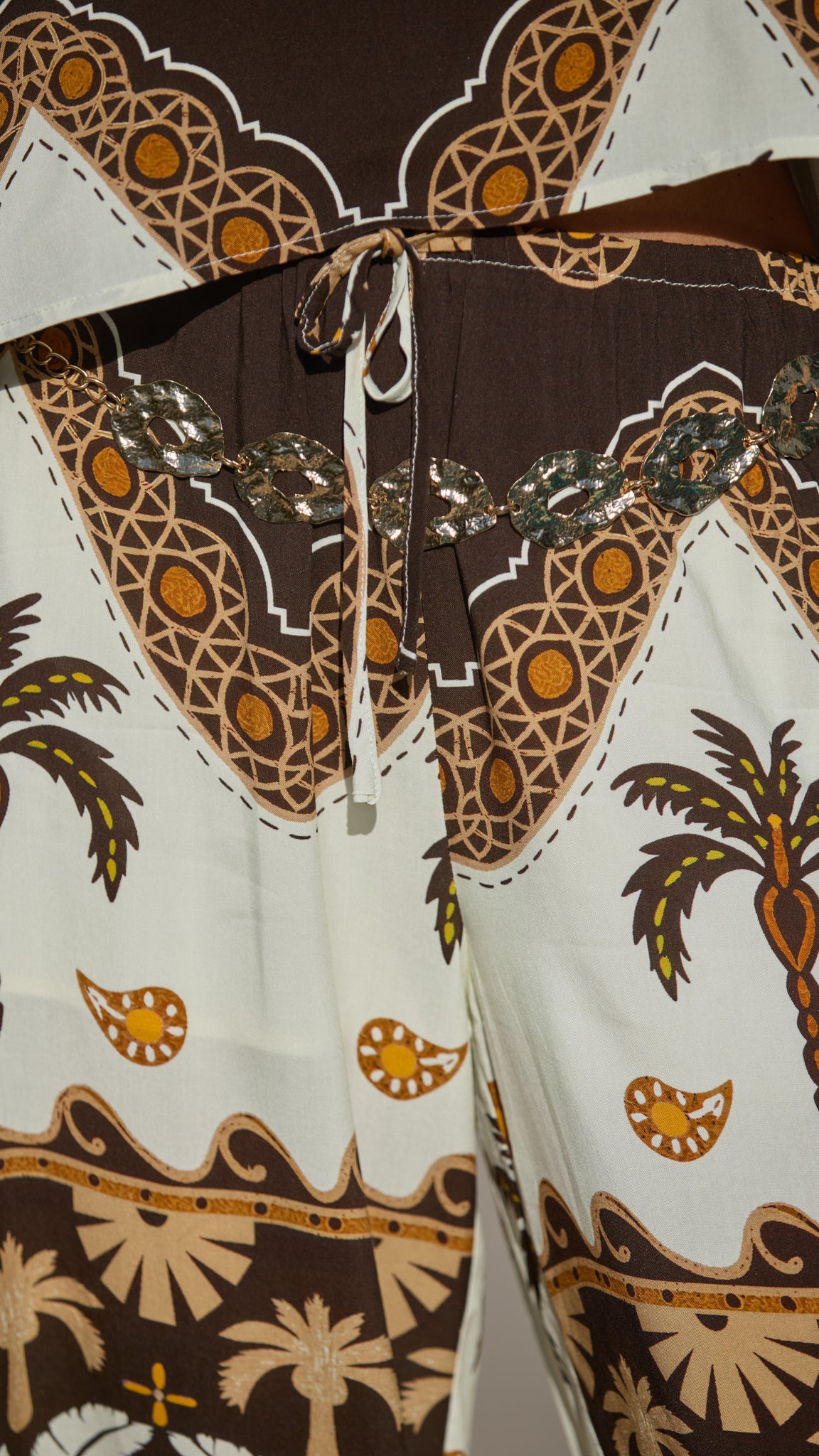Bring effortless resort style to your wardrobe with our Desert Palm Collection. The CASSIA Pants are designed with a relaxed silhouette and comfortable elasticated waistband, they drape beautifully for an easy yet polished look. The bold chocolate, cream and gold motif print adds a striking vintage-inspired feel, making them the perfect piece for holidays, warm-weather events or elevated everyday styling.