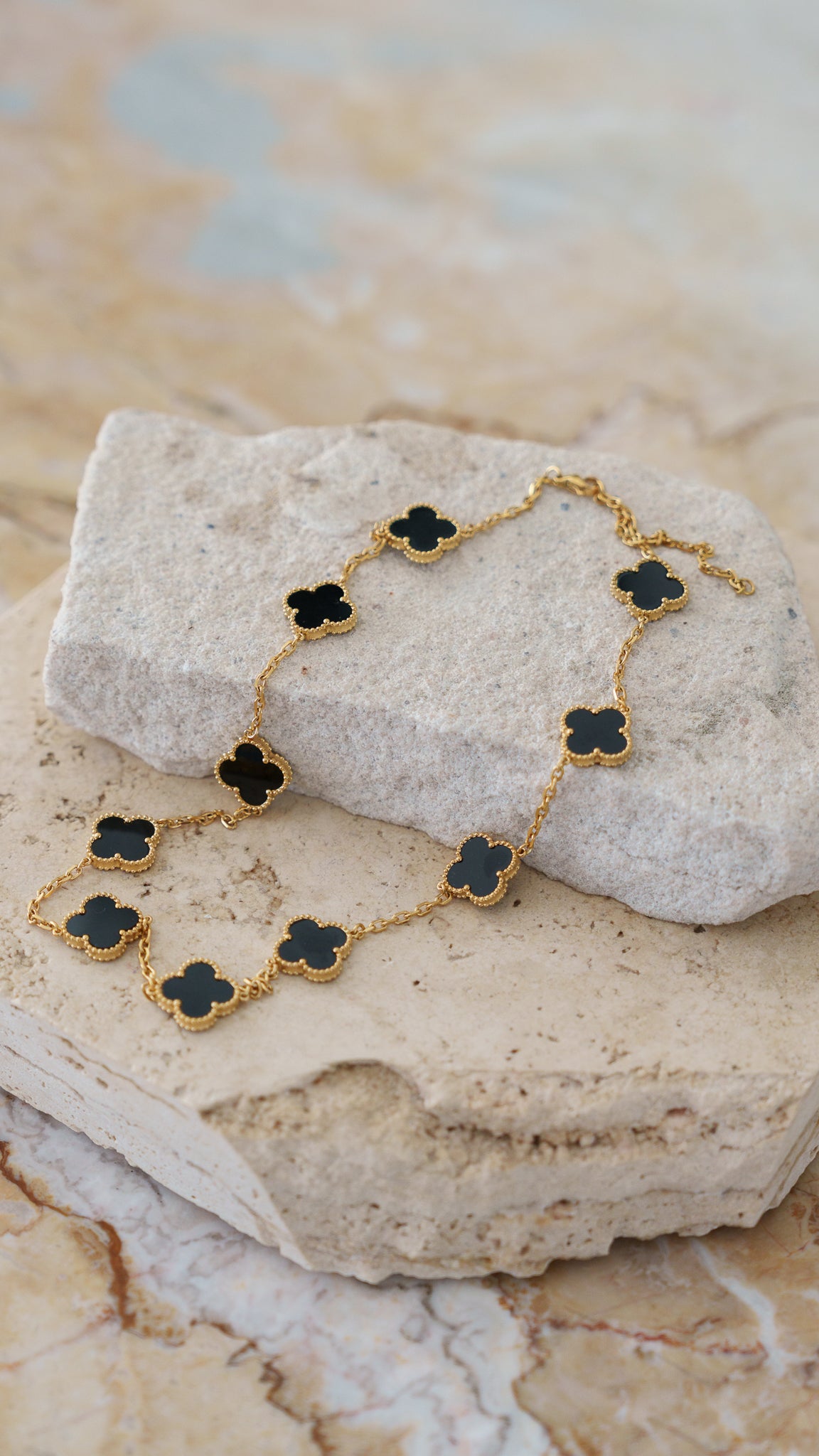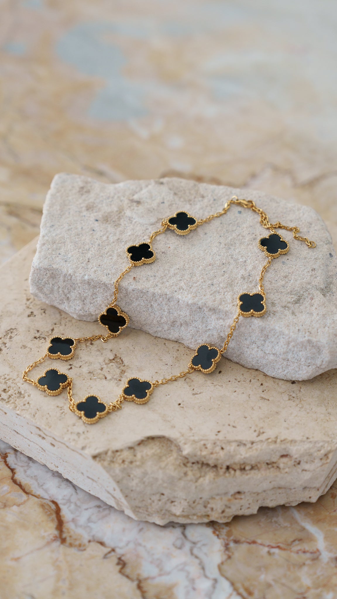 Classic, elegant & endlessly wearable. Our CHARLOTTE 18k gold plated necklace is a timeless statement in refined simplicity. Featuring a delicate chain adorned with signature clover charms, it sits beautifully along the neckline - perfect for everyday polish or layered for an elevated look.