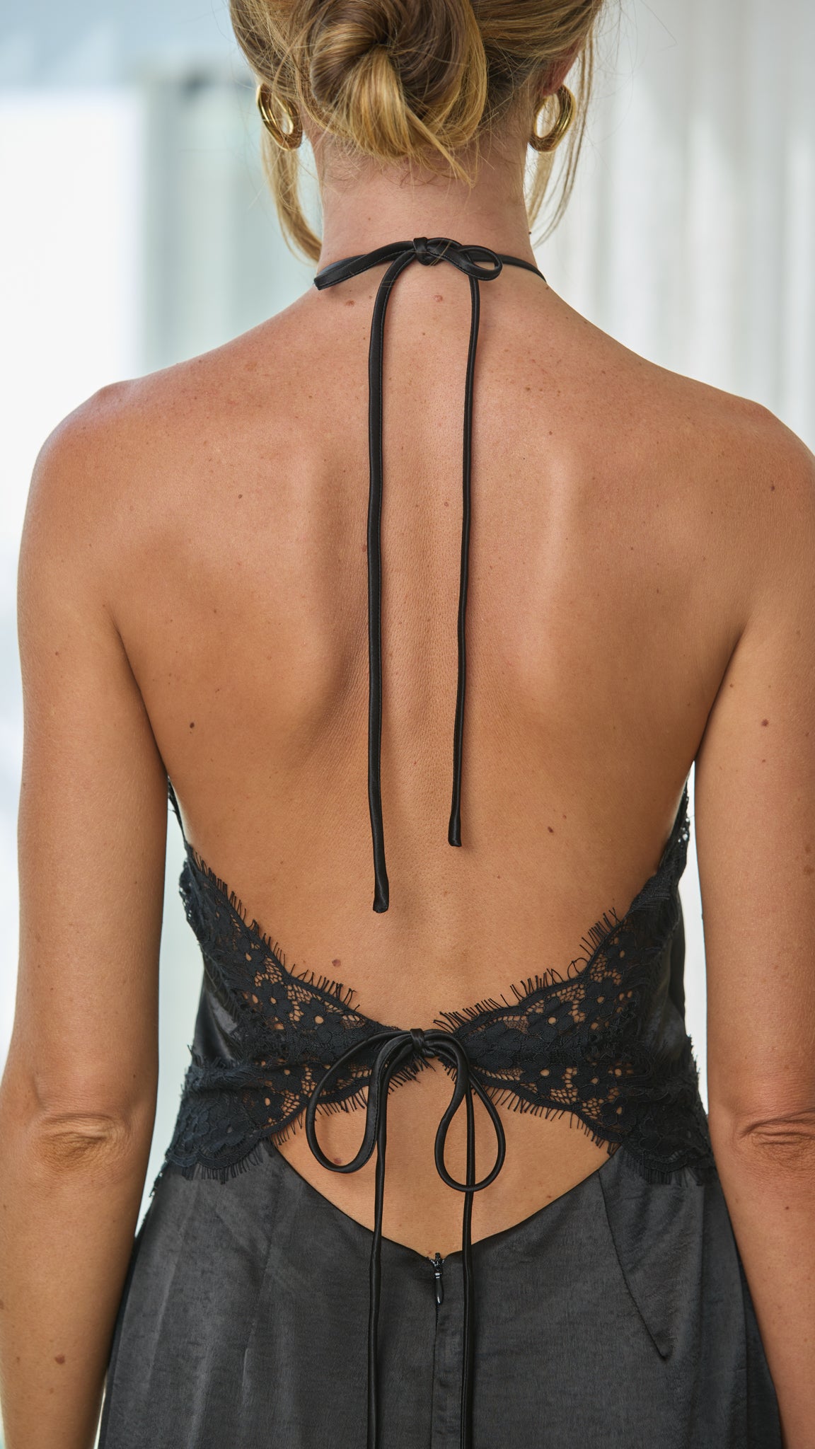- Open back with tie detail