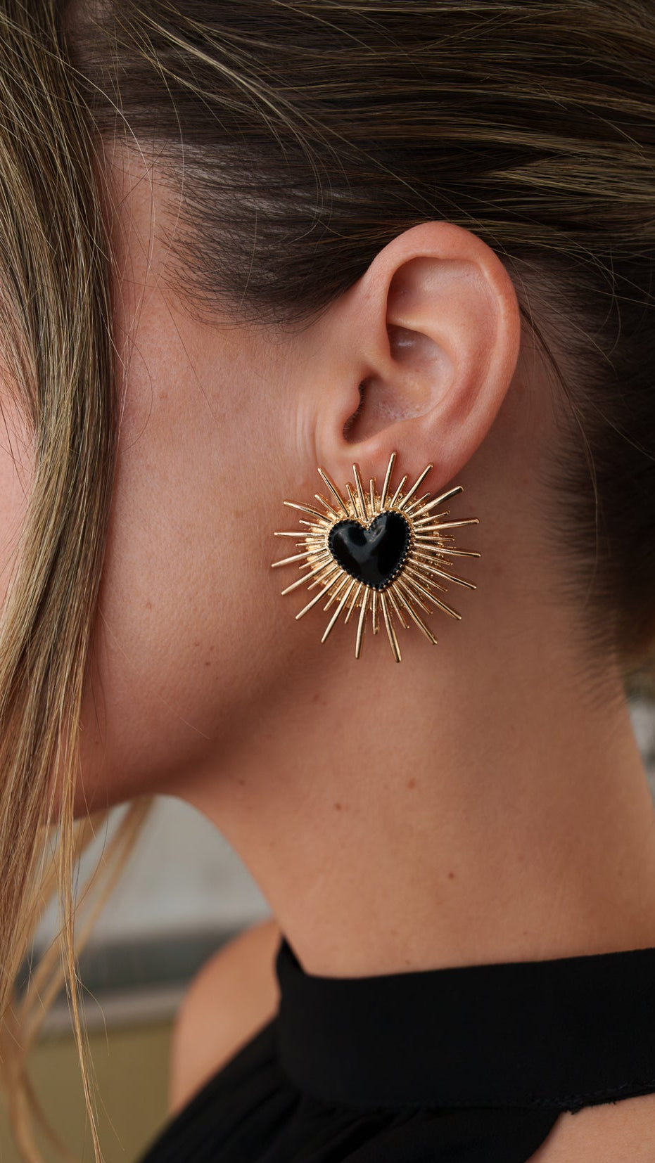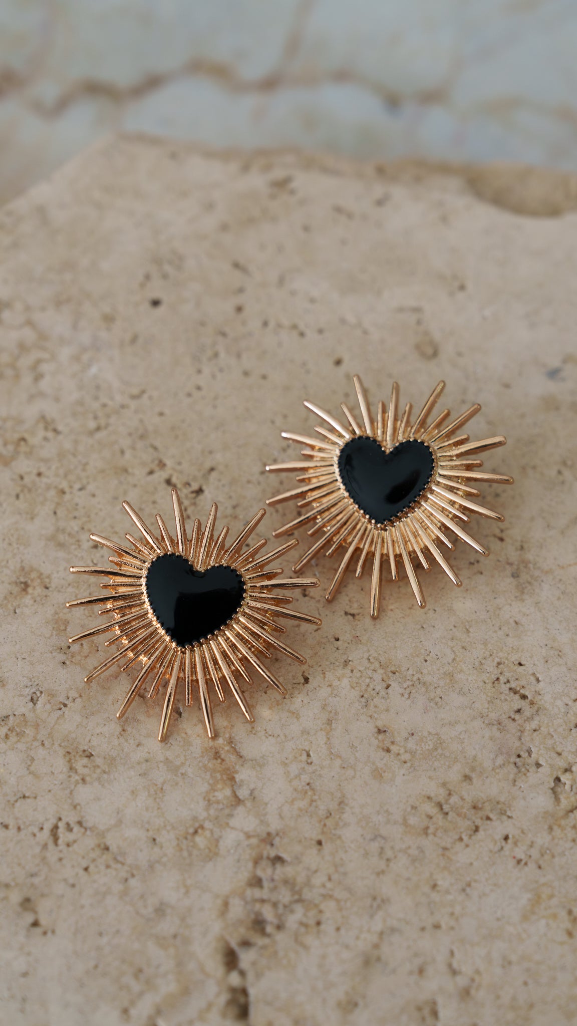 Make a bold yet elegant statement with our striking ISSY Earrings. Featuring a glossy black heart centre framed by radiant gold tone sunburst detailing, they bring the perfect balance of romance and edge.