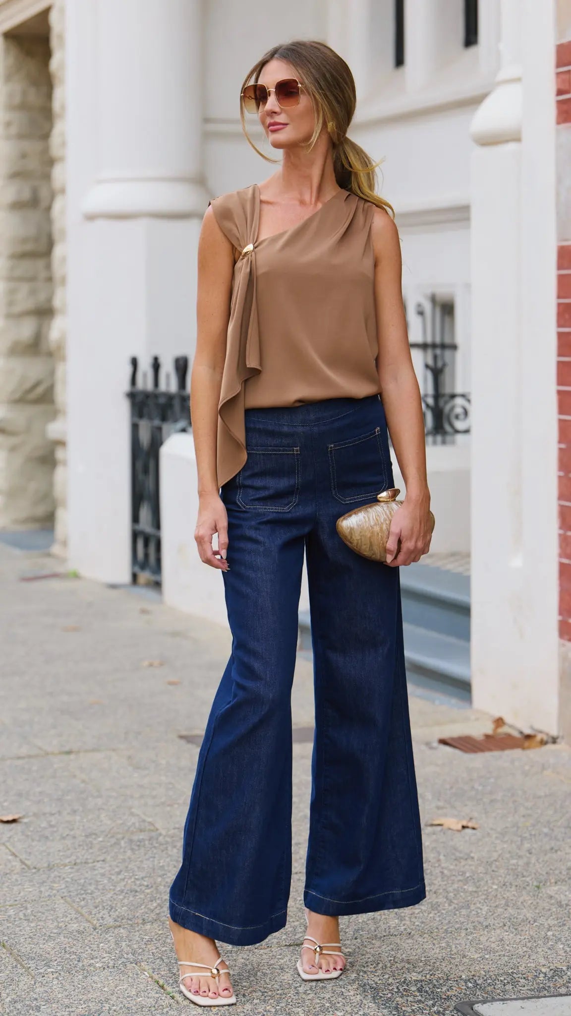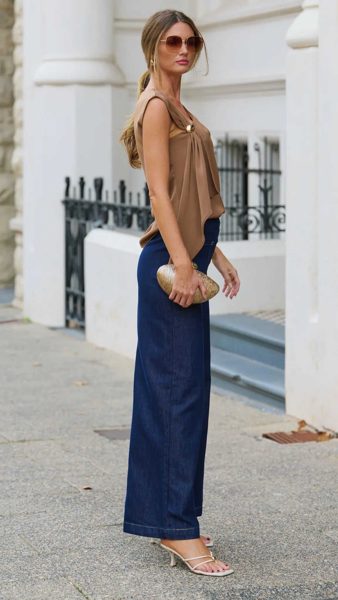 A soft, elevated essential with a modern twist! The Gold Buckle Top top features a delicate draped detail secured with a statement ring, creating effortless movement and a refined silhouette. Perfect for dressing up your everyday wardrobe or styling into occasion wear. Also available in Ivory.