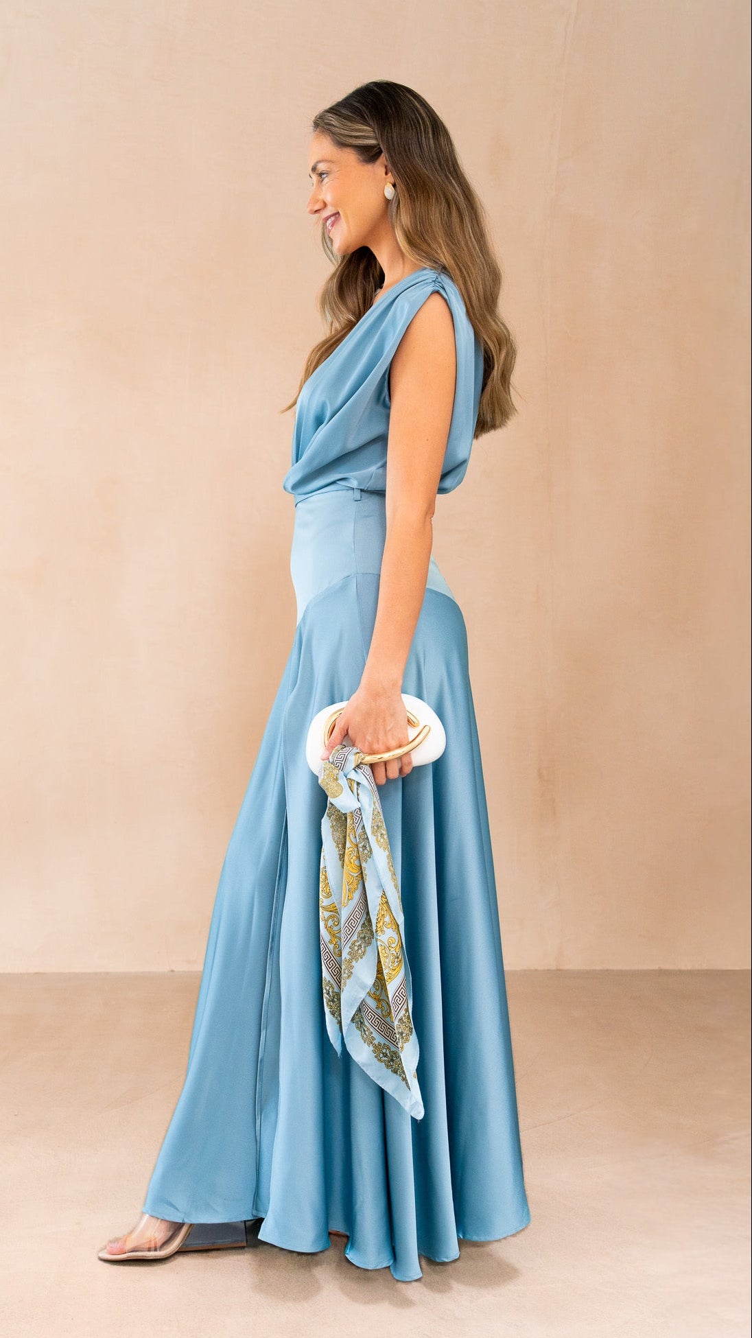 - The most stunning dress for your next event, in a beautiful dusty blue satin.