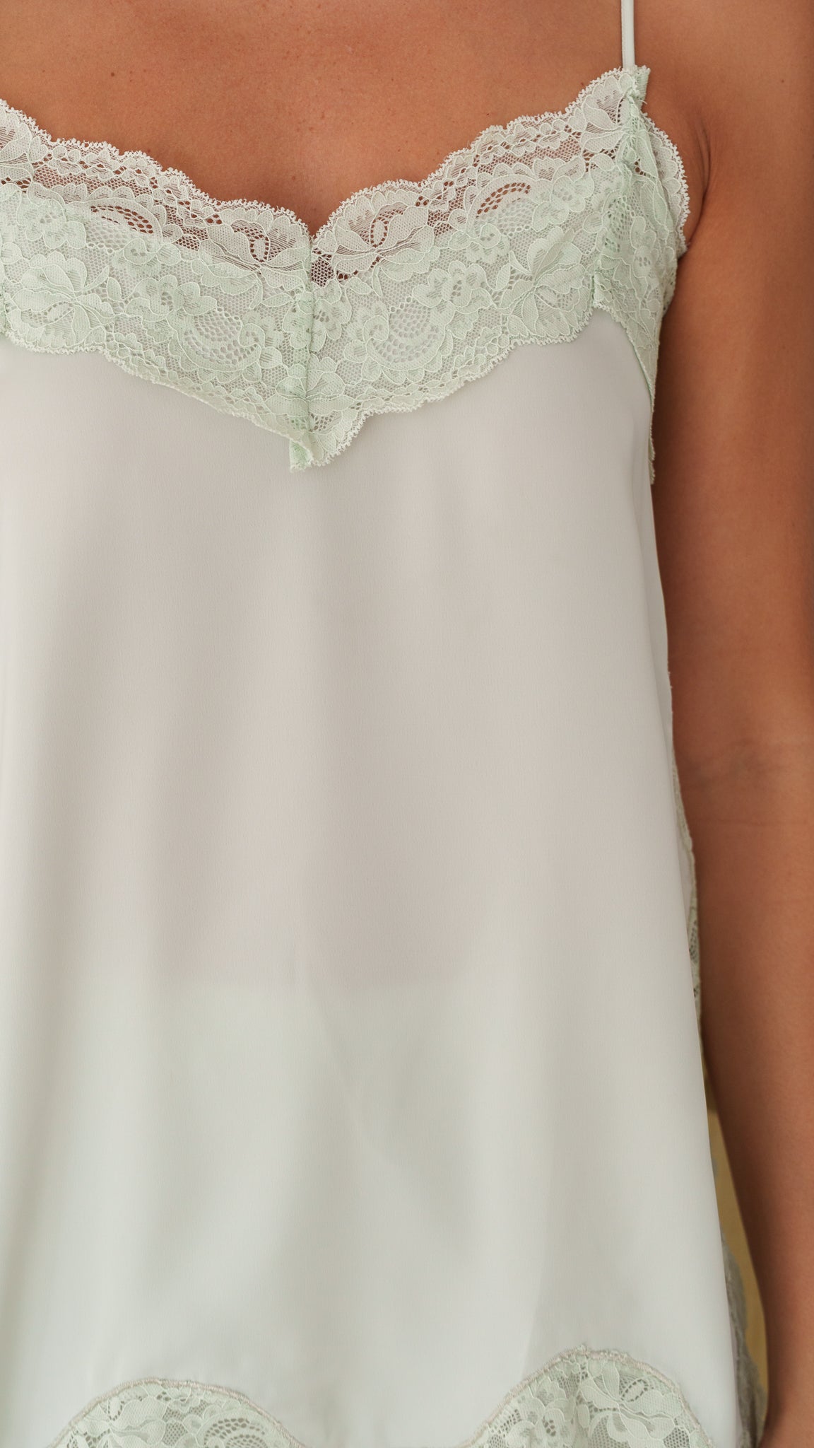 - Lace trim on front neckline