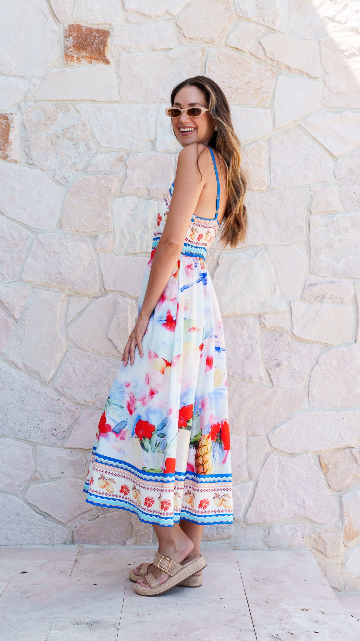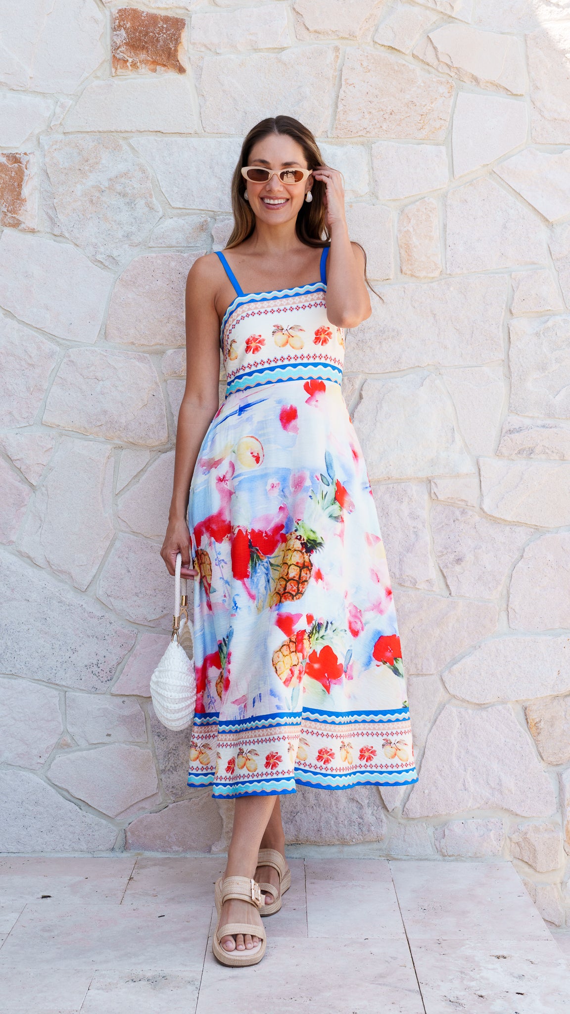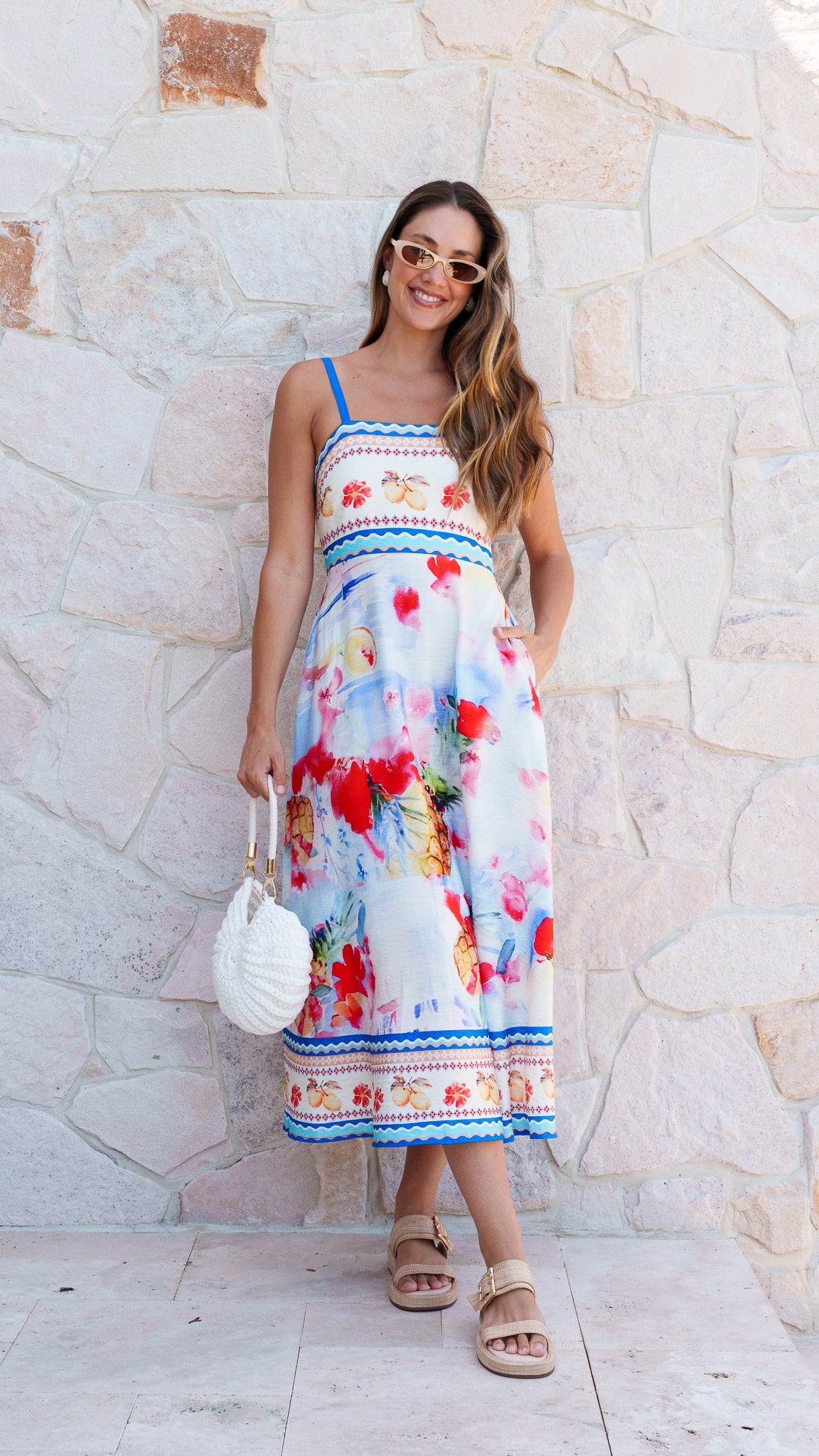 Sunshine in dress form ☀️ This breezy midi is made for warm days and happy plans. With a playful tropical-inspired print, flattering fitted bodice and floaty skirt, it’s equal parts fun and feminine. Easy, comfy and guaranteed to put you in a good mood. Perfect for holidays, brunch dates and chasing the sun all day long! Styled with the LARS Raffia Sandals and OCEAN Crochet Bag.