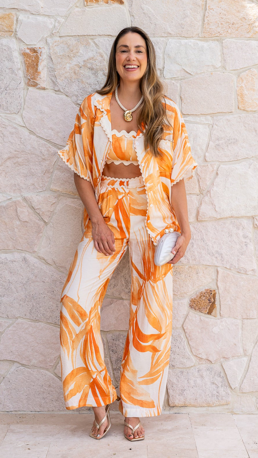 Introducing the perfect warm weather set for effortless style and comfort! This three-piece set features flowy wide-leg pant, a relaxed button-down shirt, and a coordinating cropped top. Whether worn together for a striking coordinated look or mixed and matched for easy versatility, this set brings laid-back elegance to any day out.