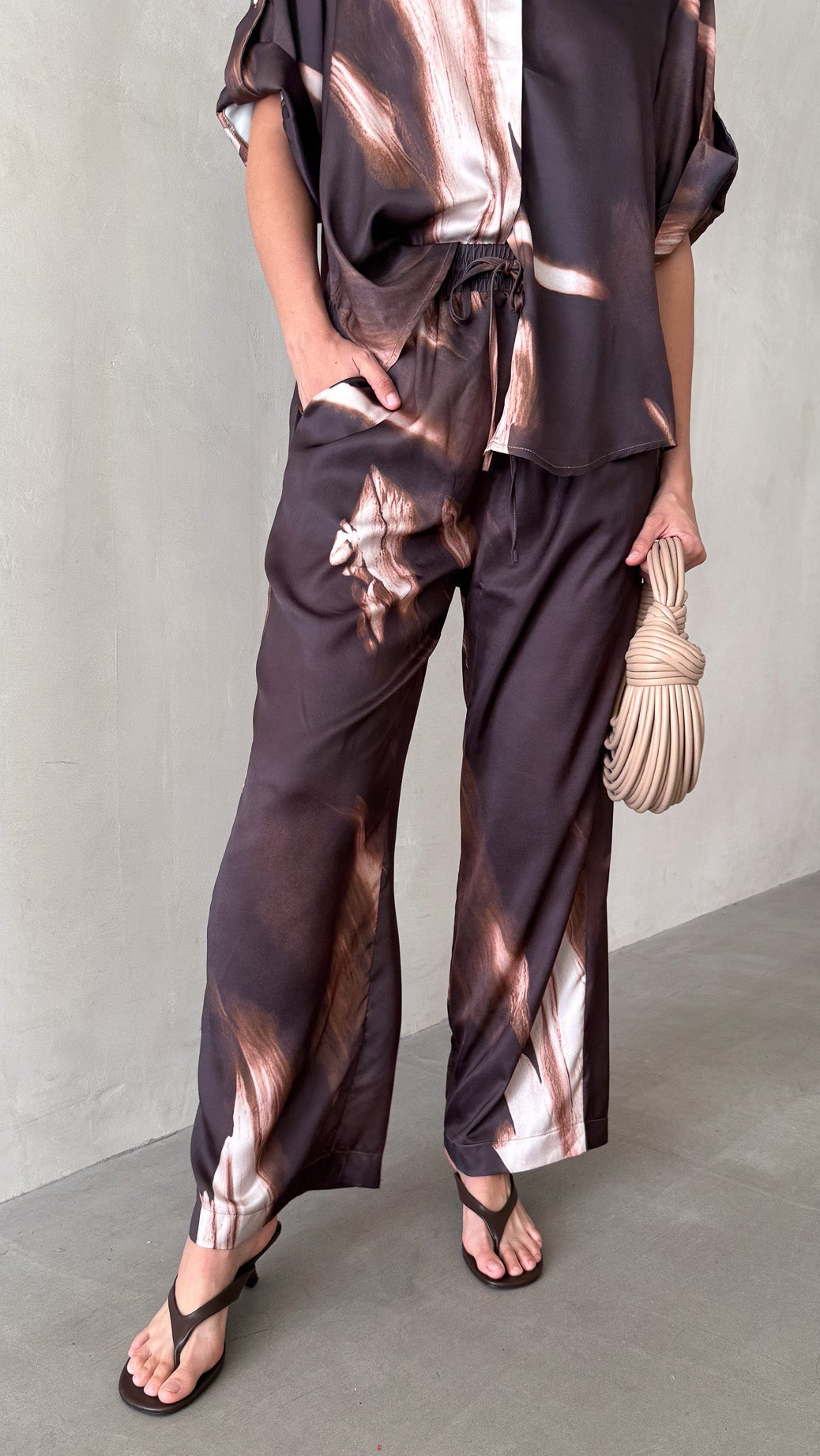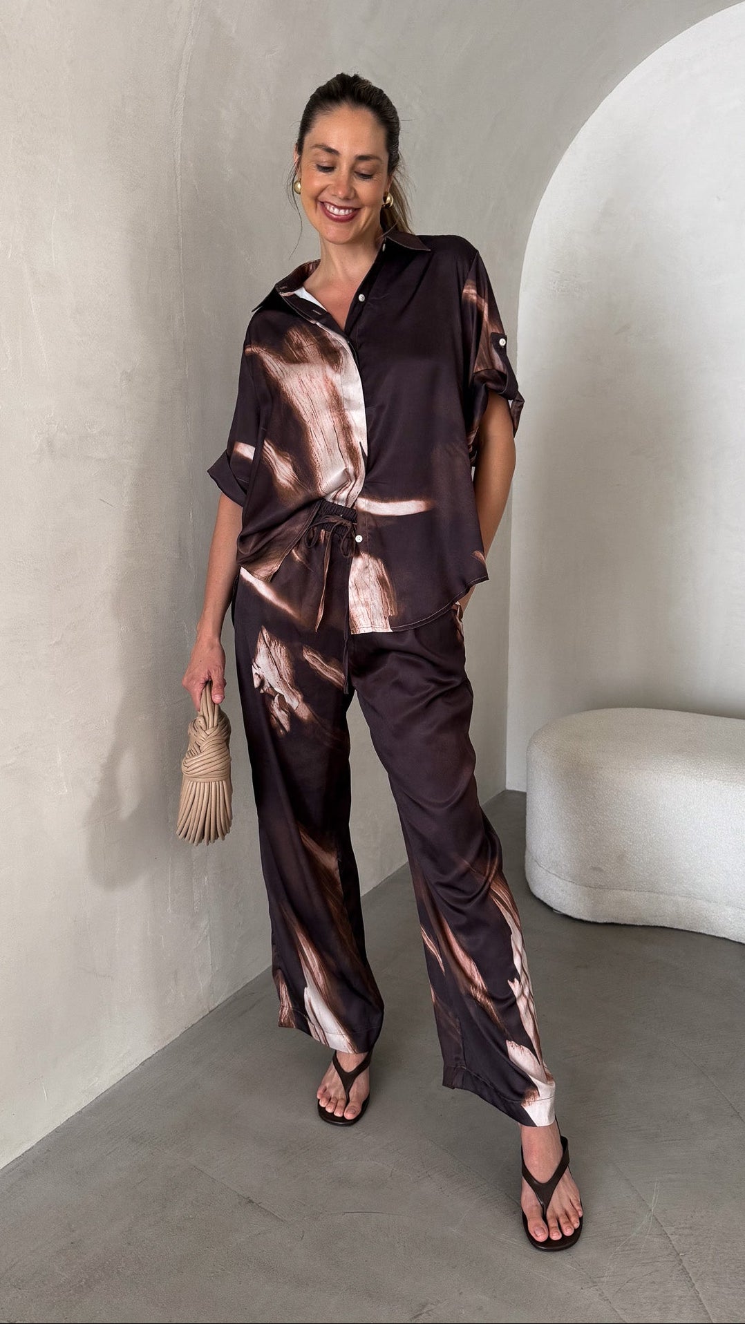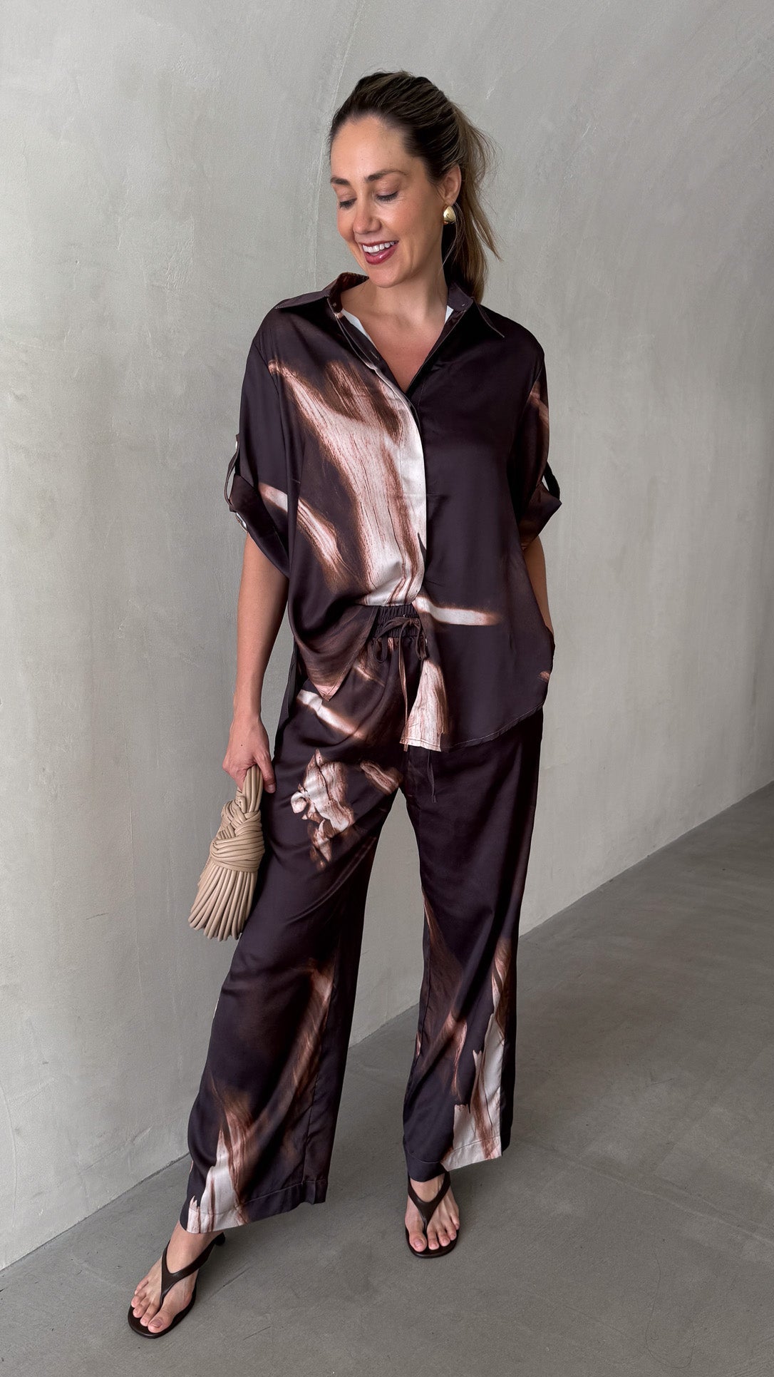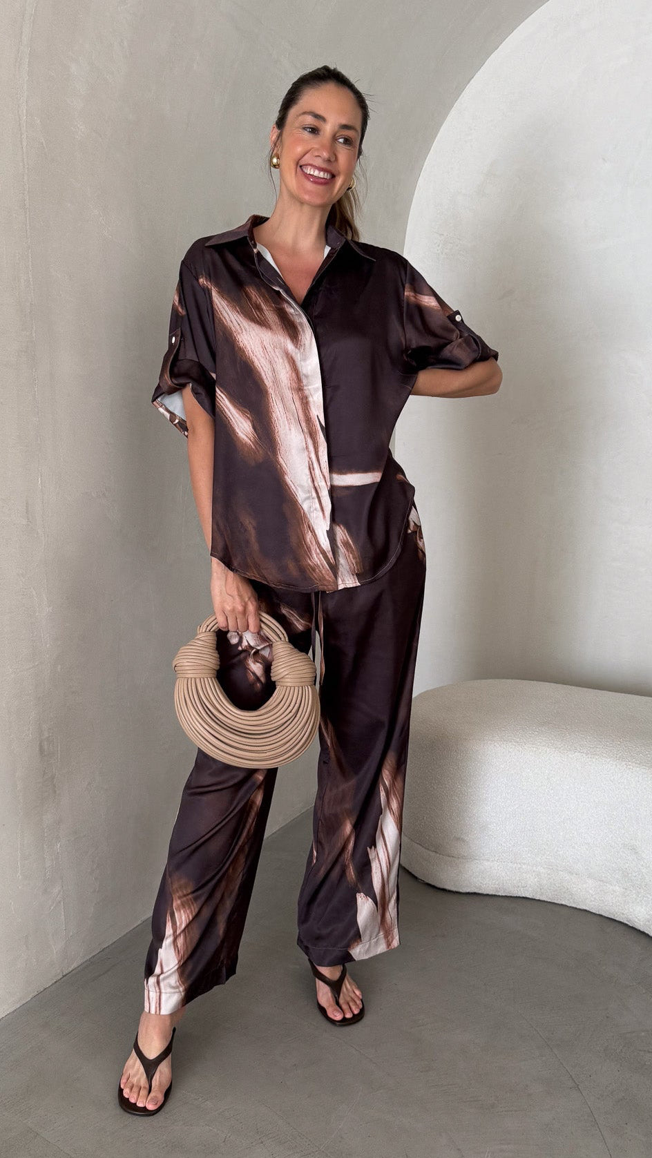 - Elevate your set game is our chocolate multi, silky luxe pants! Pair with our SILAS Button up shirt for the ultimate co-ord look!