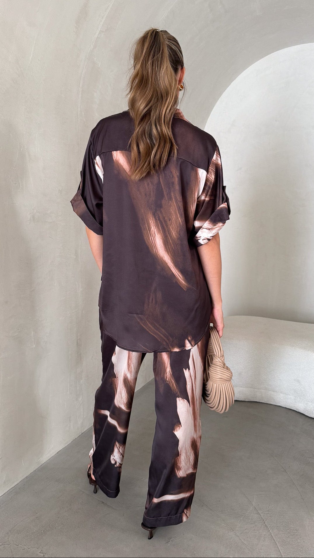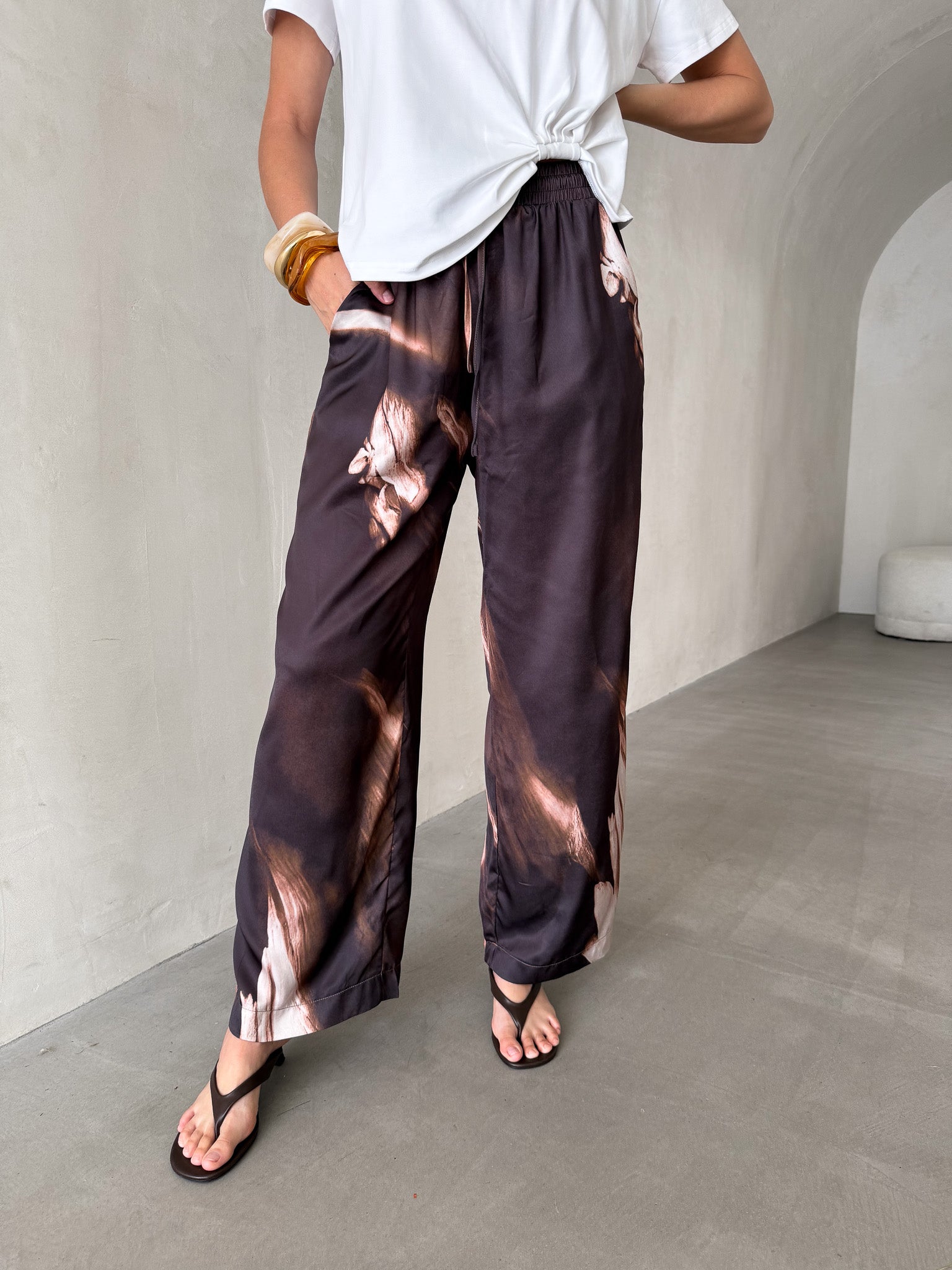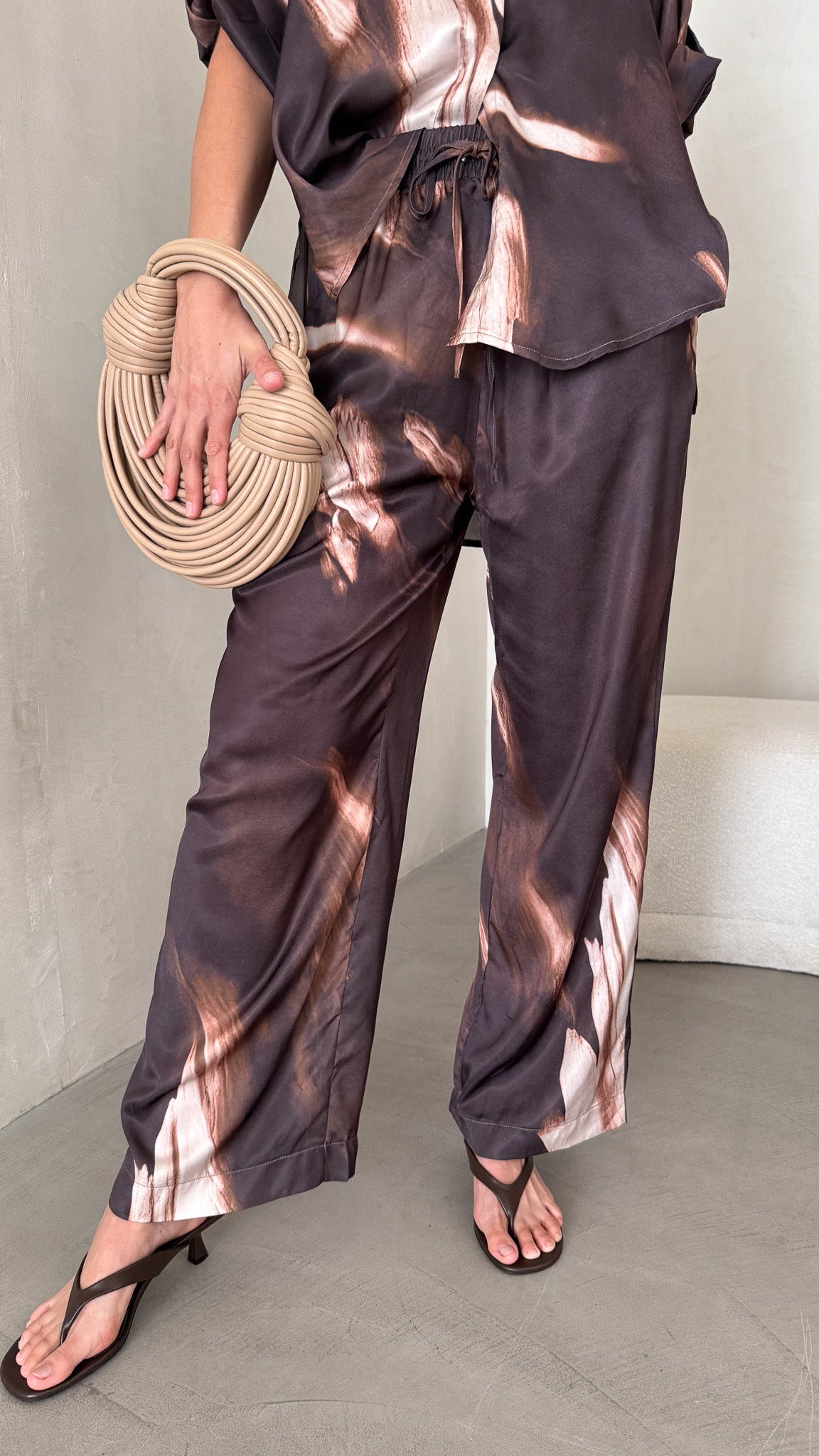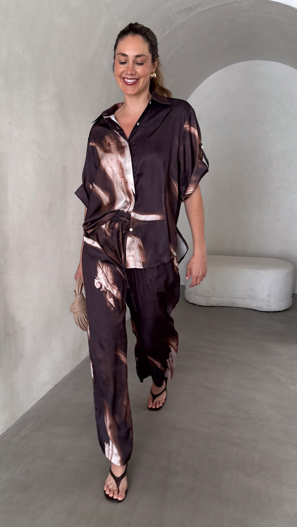 - Elevate your set game is our chocolate multi, silky luxe pants! Pair with our SILAS Button up shirt for the ultimate co-ord look!