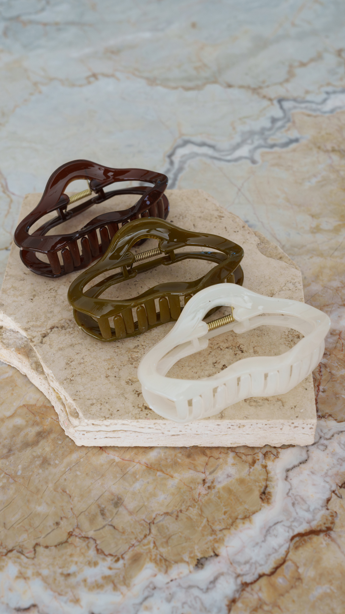 Our SOFIE Claw Clips come in a set of 3, the perfect accessory to keep your hair in place. Featuring rich, neutral tones in brown, olive, and white, these clips are designed to suit any hair type or style.