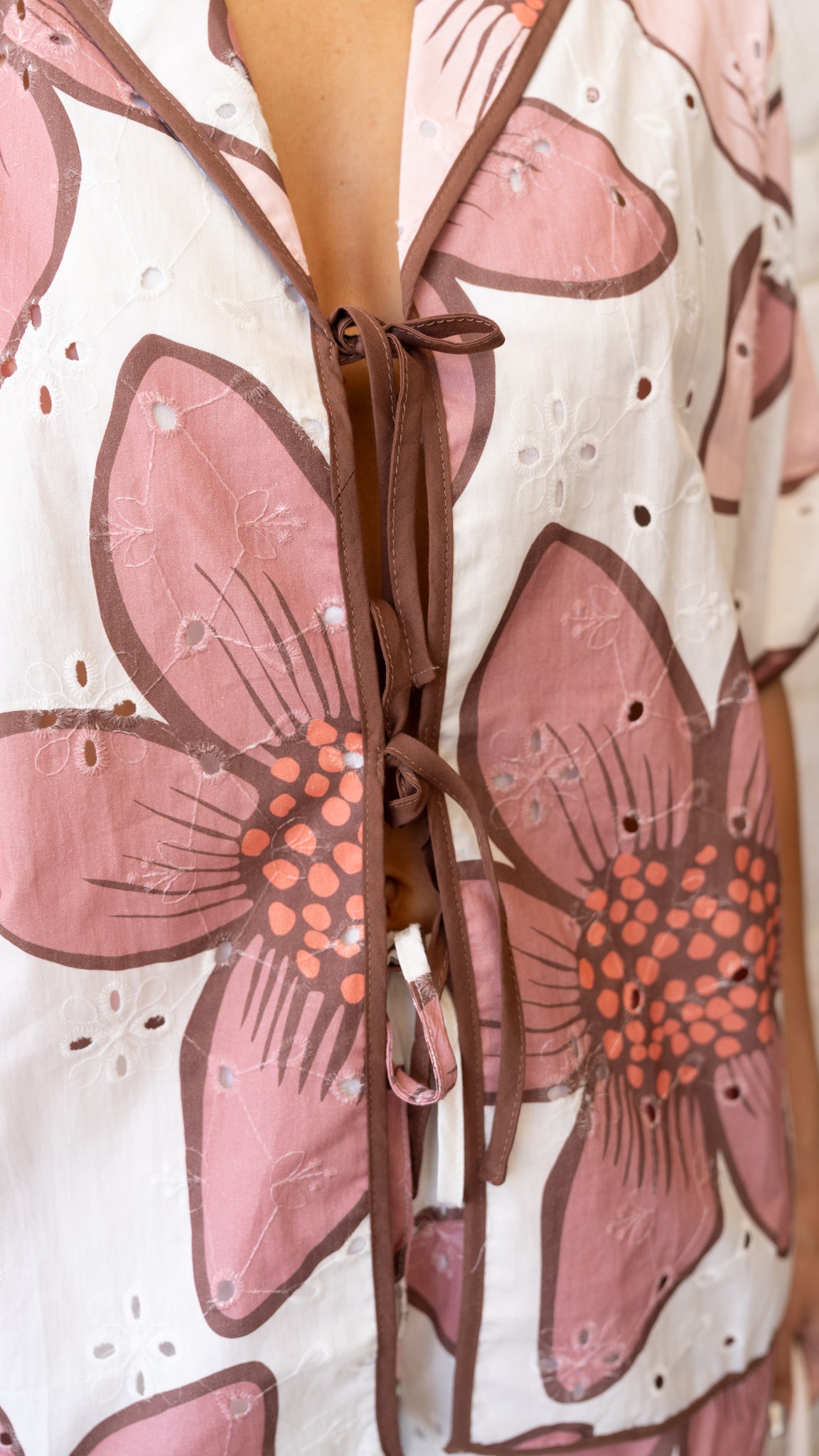 - Featuring a tie up front with contrast brown binding.