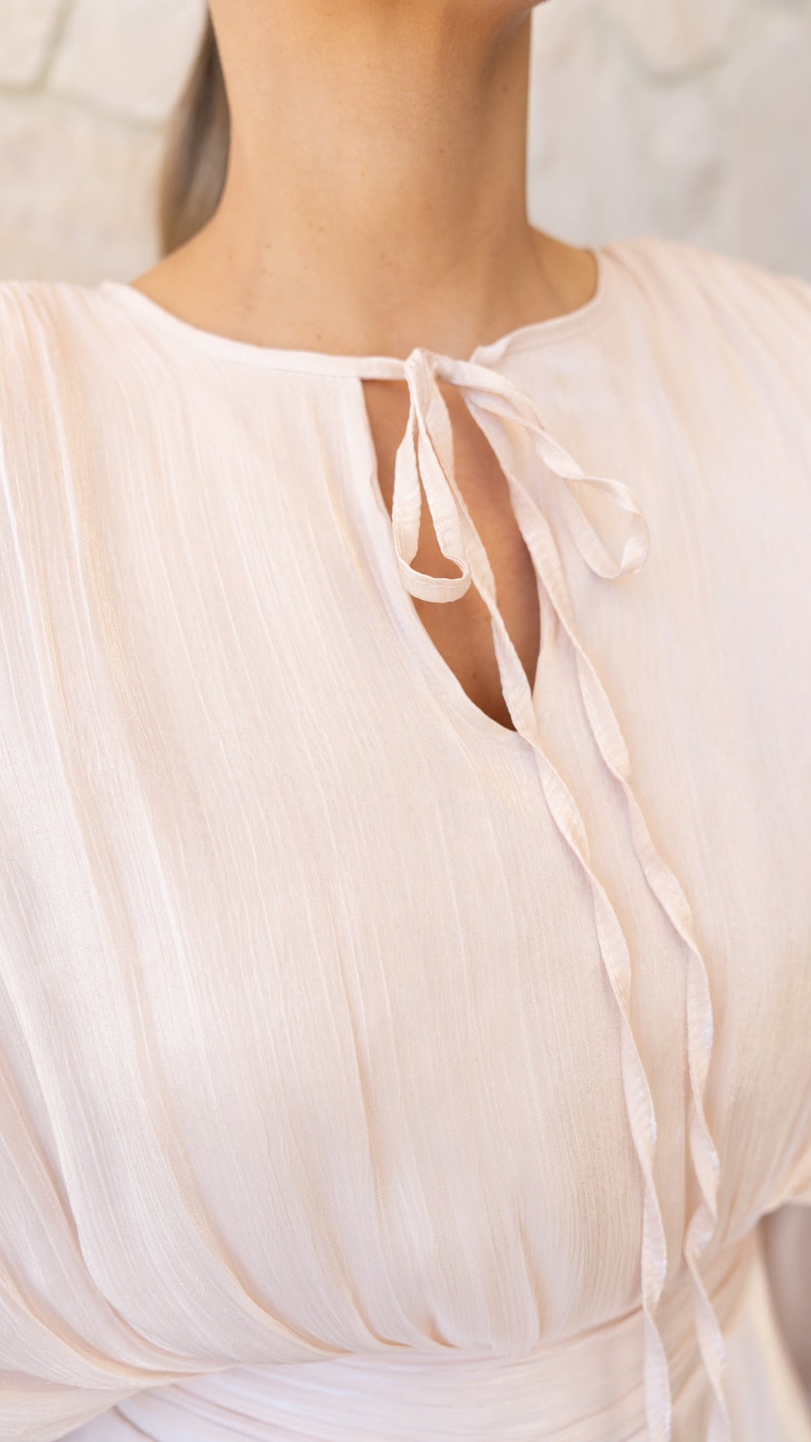The SUKI gives vintage charm with a modern twisr. Crafted from a lightweight pleated chiffon with the most beautiful champagne gleam throughout, she'll see you glistening the night away!