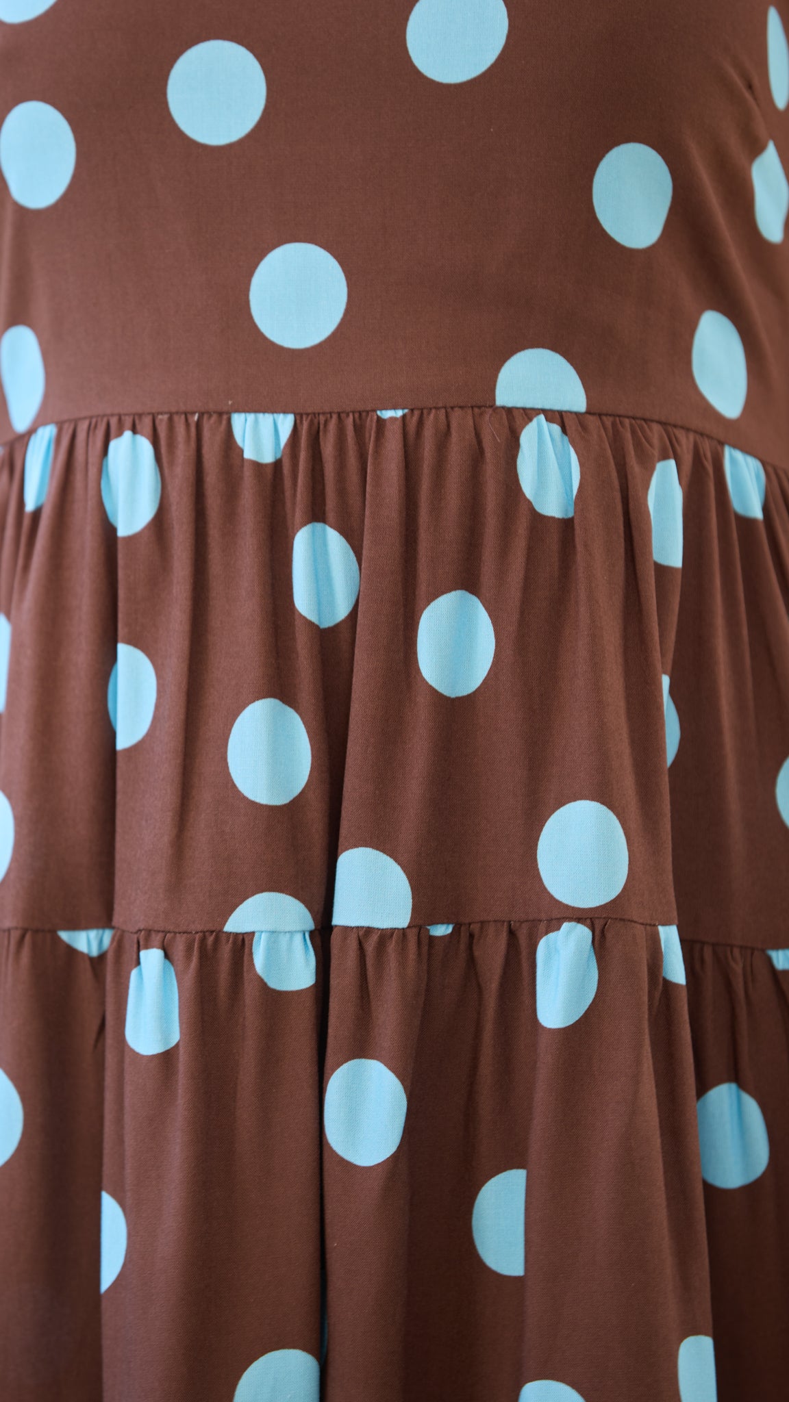 Playful with a retro twist! Part of our Rosalie Collection, the TALLULAH is a blend of sweet and stylish. Designed with a flattering square neckline and delicate adjustable straps, it features a fitted bodice that flows into a tiered skirt for soft movement and an easy, feminine silhouette. The rich chocolate base paired with soft blue polka gives it a fun, vintage-inspired feel that’s perfect for sunny days, brunch dates or weekend outings. Also available in Pink/Chocolate.