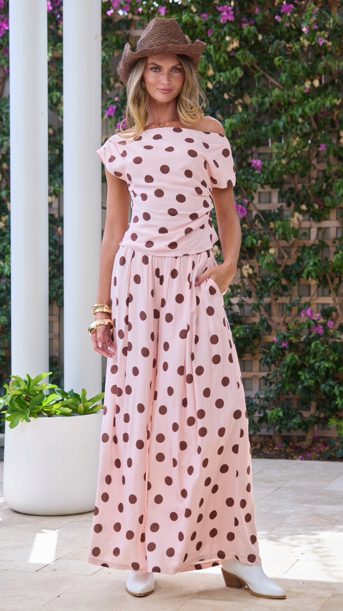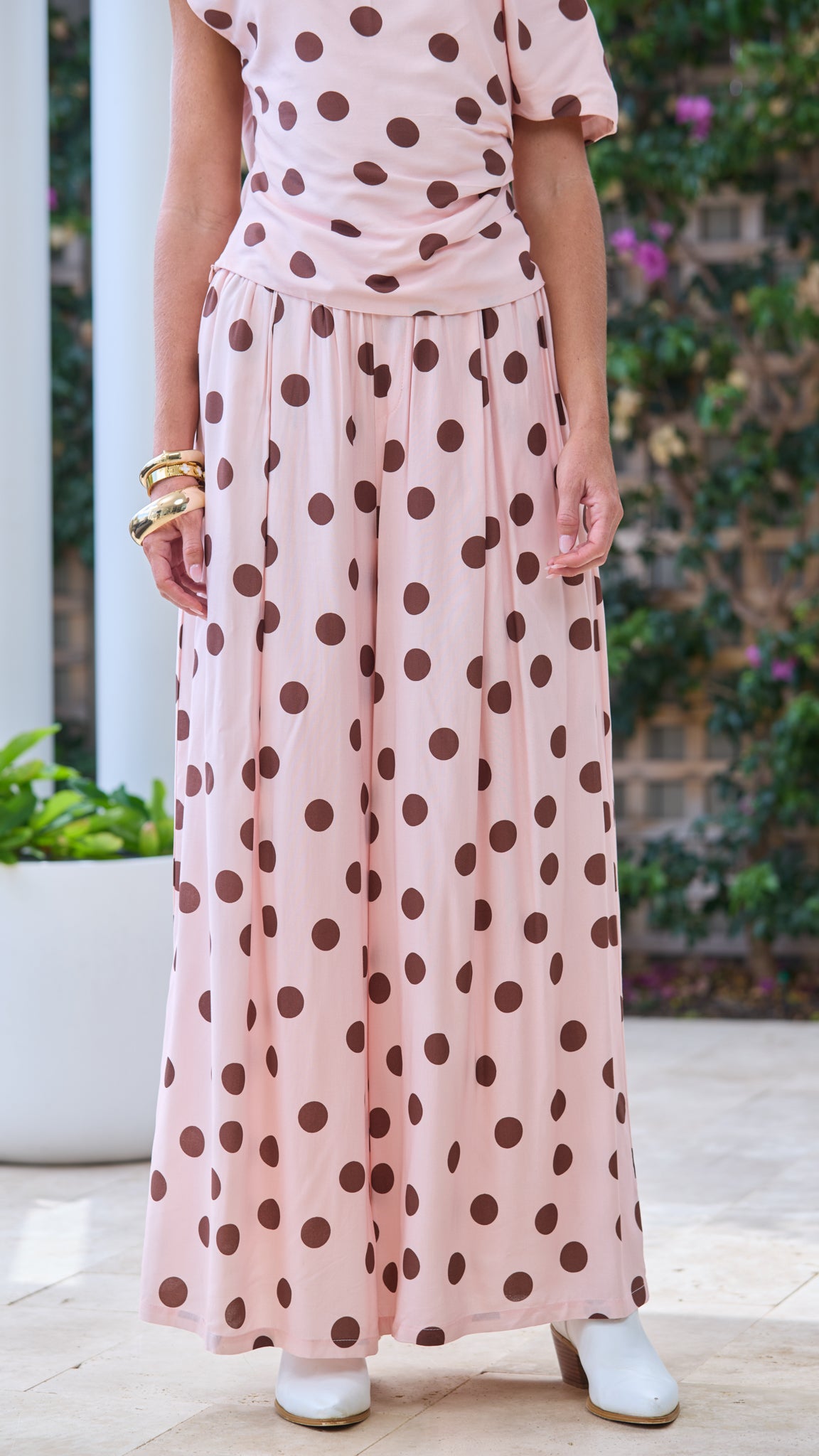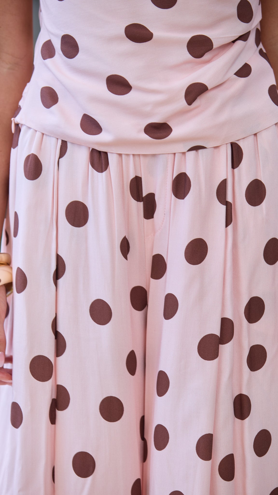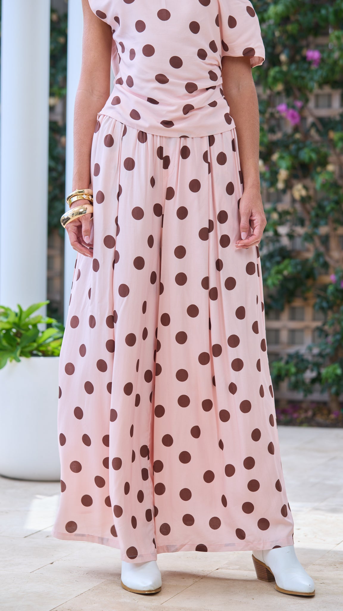 Playful, breezy and effortlessly chic and part of our Rosalie Collection, the TAMSIN wide-leg polka dot pants are designed for comfort without compromising on style. Featuring a relaxed silhouette and elasticated waistband, they flow beautifully with every step. The sweet pink base paired with chocolate brown polka dots adds a fun vintage-inspired feel, making them perfect for pairing with the matching top or styling with simple basics for an easy statement look.